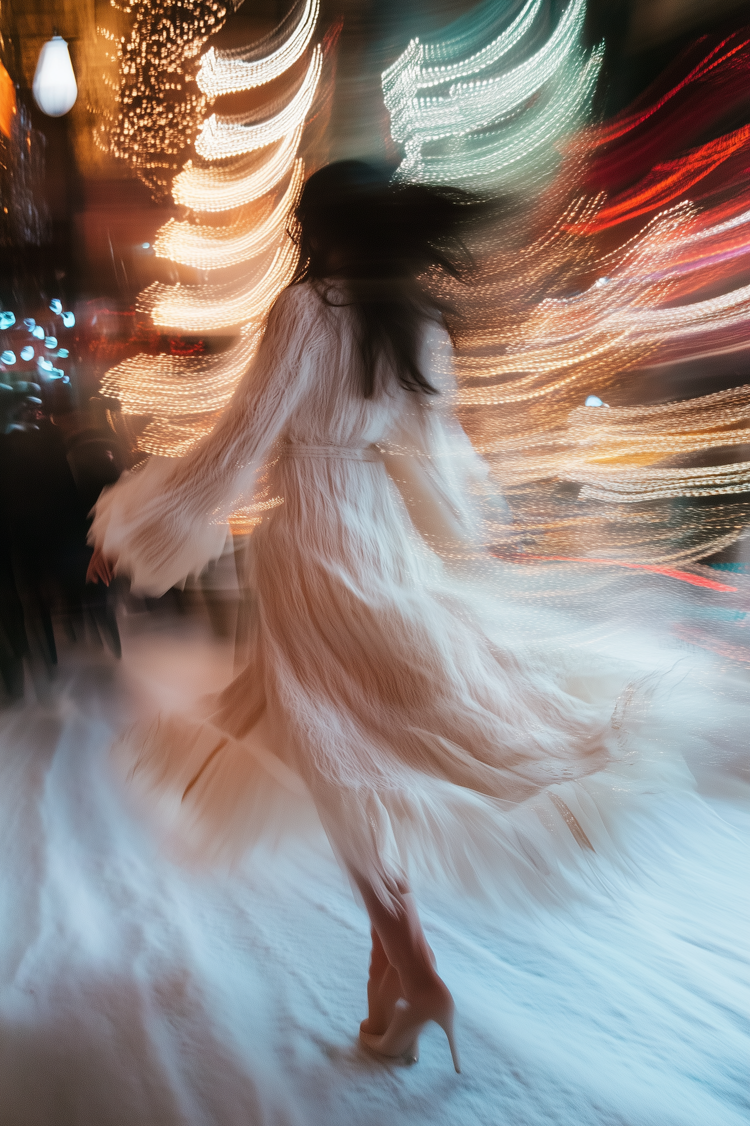 A woman in a flowing white dress dances amidst swirling festive lights, creating a dynamic and ethereal winter scene.