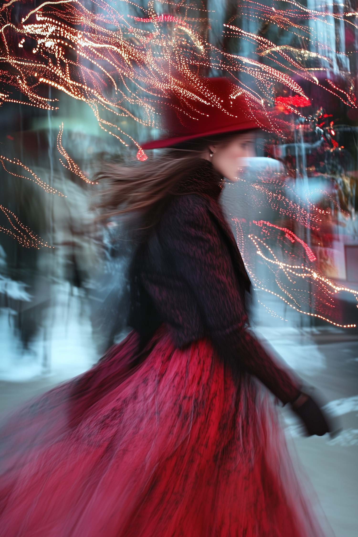 Artistic motion blur of a woman in a red dress and hat, walking amidst vibrant festive lights in a dreamy, dynamic scene.