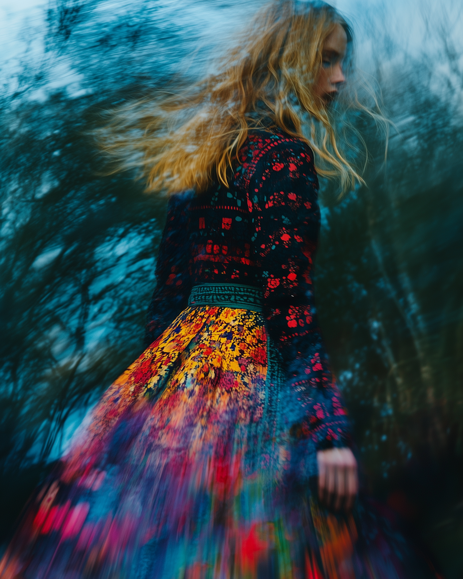 A young woman in a vibrant, multicolored dress stands in a blurred, dynamic scene, creating a sense of movement and mystery.