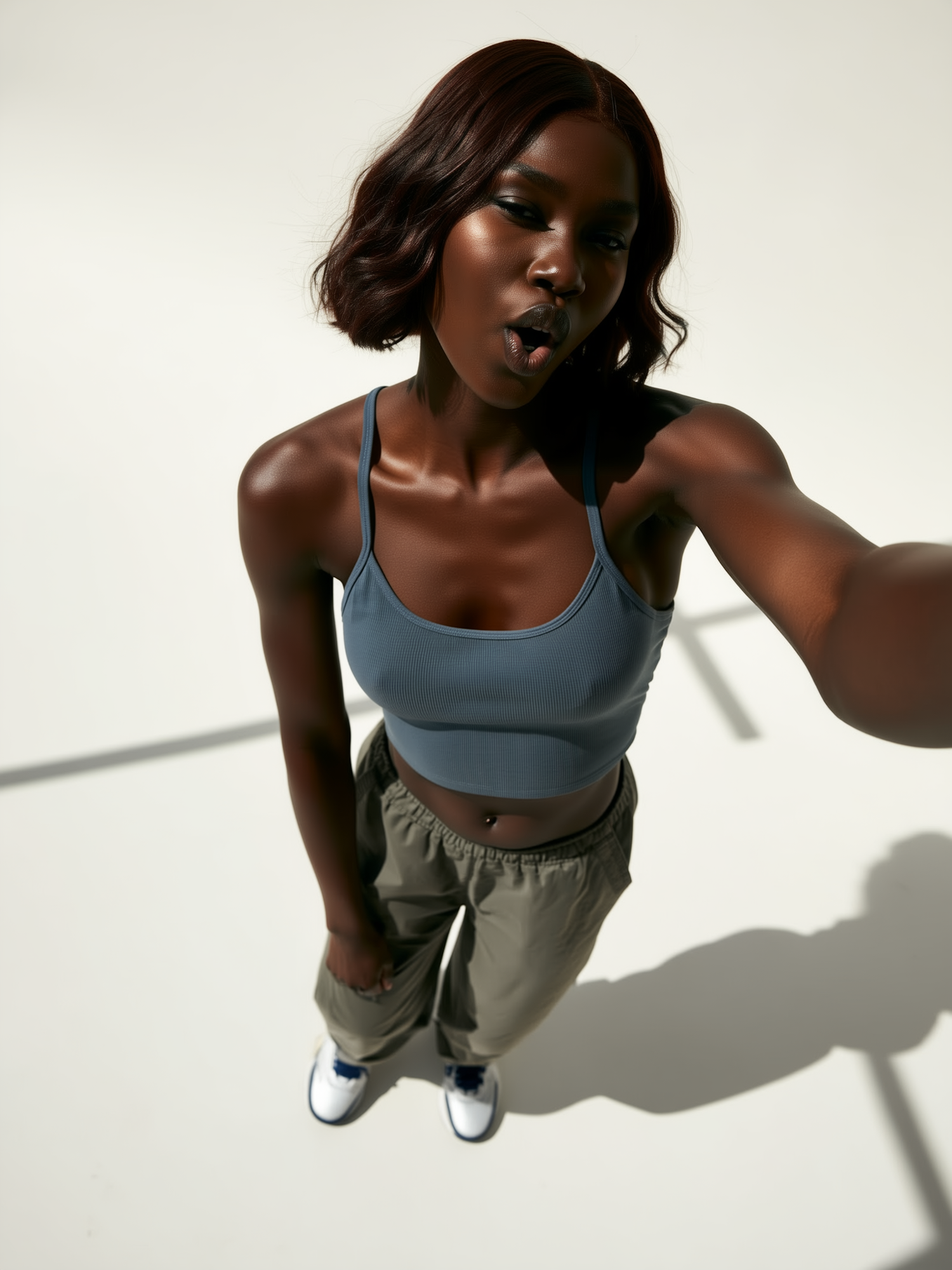 A stylish woman in a blue tank top and khaki pants poses dynamically under bright lighting, showcasing her lively expression and modern outfit.