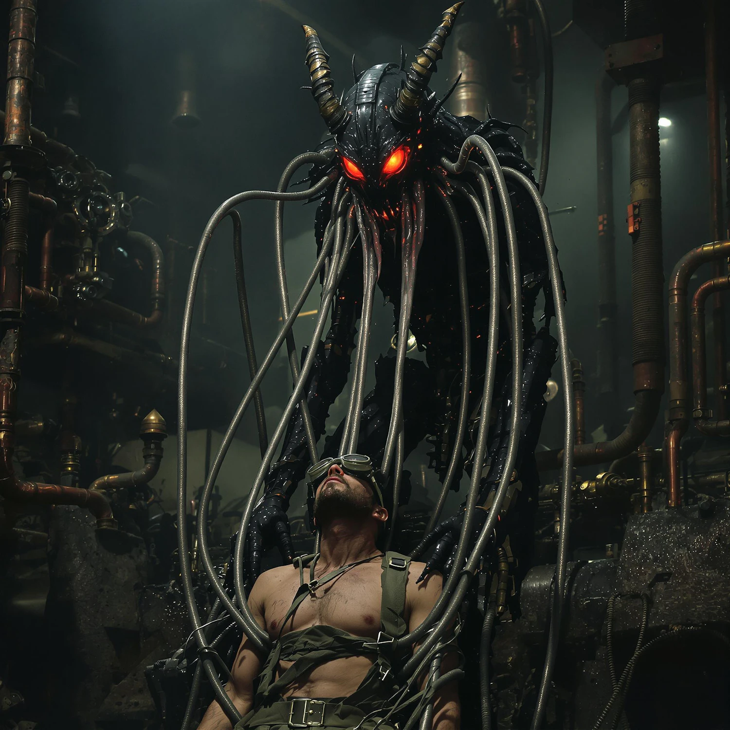 A terrifying biomechanical creature with glowing red eyes looms over a restrained man in a dark, industrial setting filled with pipes.