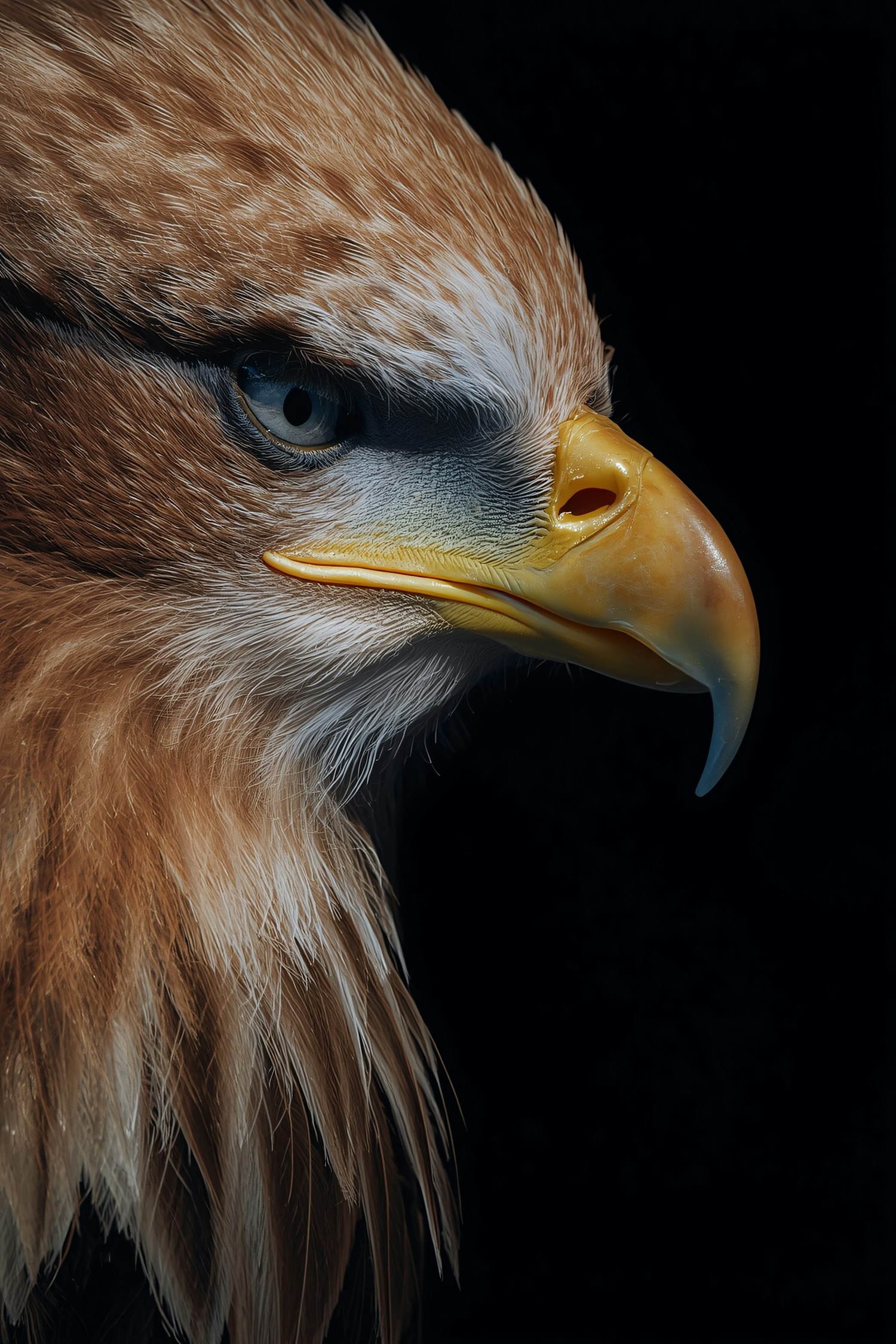 Close-up of an eagle's head with a sharp yellow beak and piercing blue eye, set against a dark background for dramatic effect.
