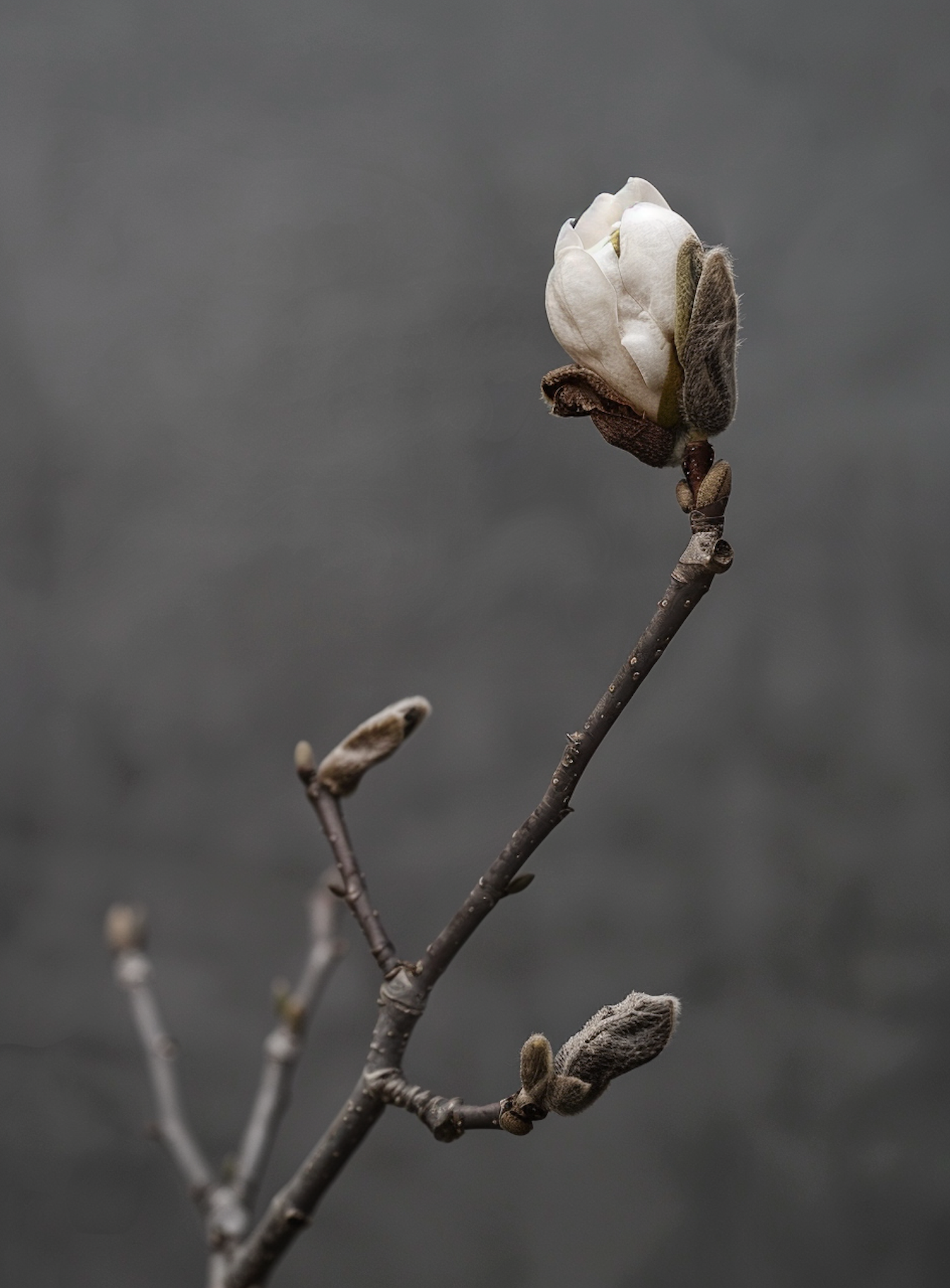Close-up of a magnolia bud with white petals against a soft gray background, highlighting its delicate beauty and natural textures.
