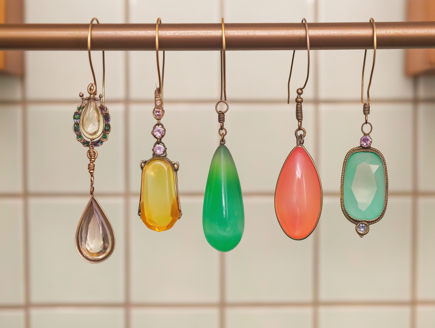 Elegant earrings with colorful stones hang on a rod against a tiled background, showcasing unique designs and vibrant hues.