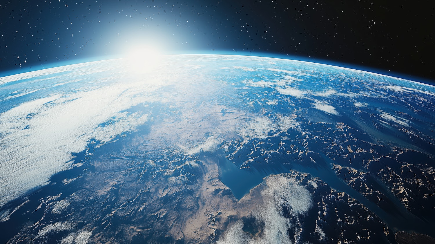 Stunning view of Earth from space with a sunrise, clouds, and stars, highlighting the planet's beauty and the vastness of the cosmos.