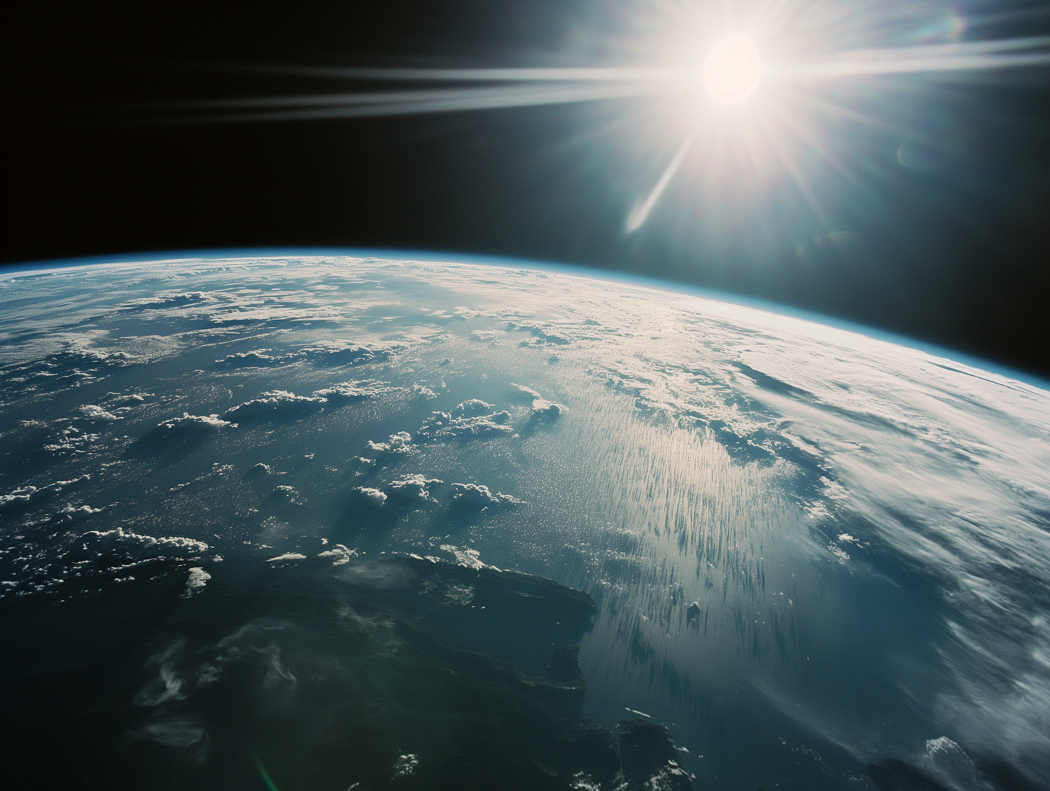 Stunning view of Earth from space with the sun shining brightly, highlighting the planet's curvature and cloud-covered surface.