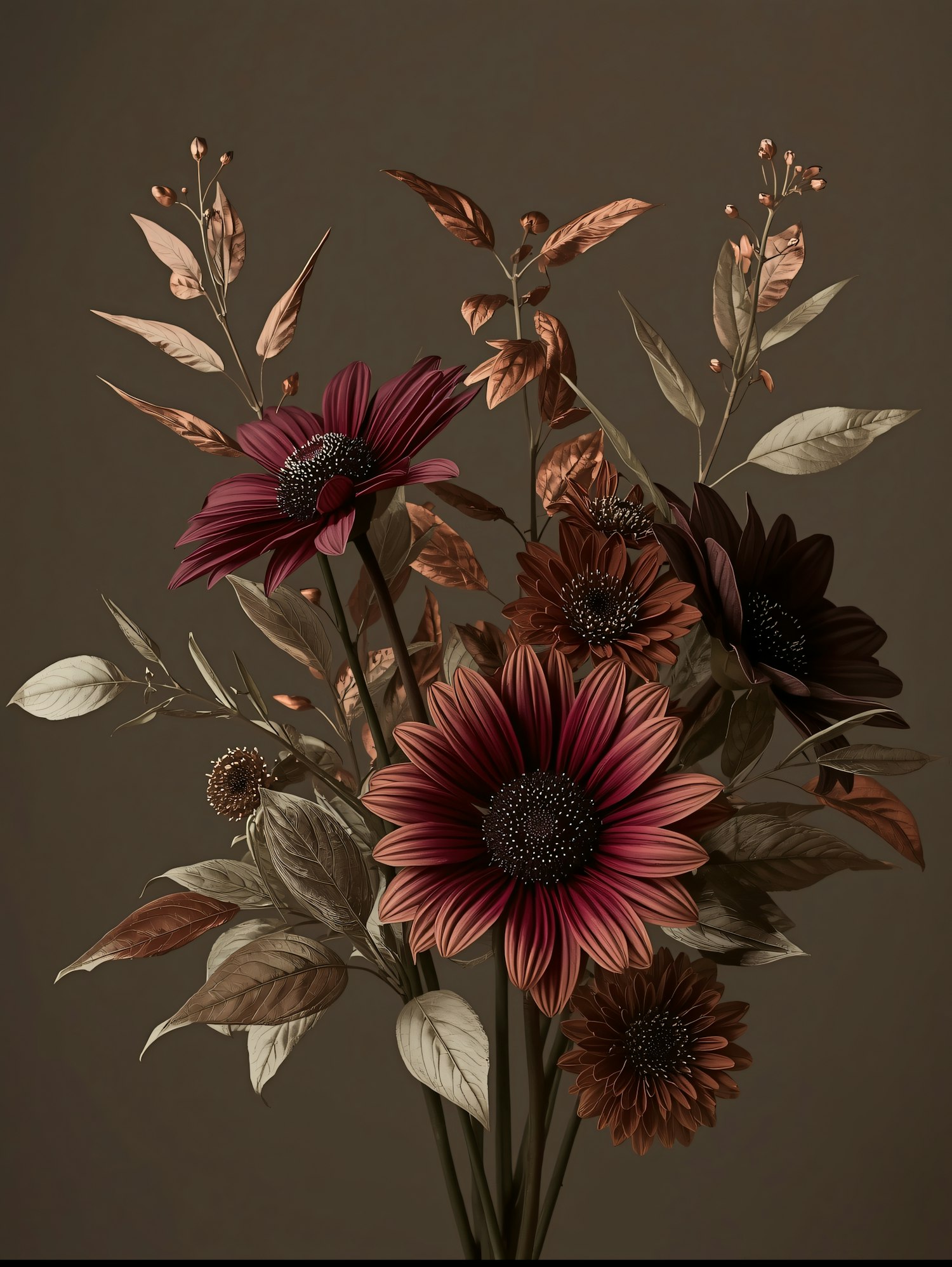 A stunning floral arrangement with deep red and brown flowers, set against a neutral background, emphasizing its natural elegance.