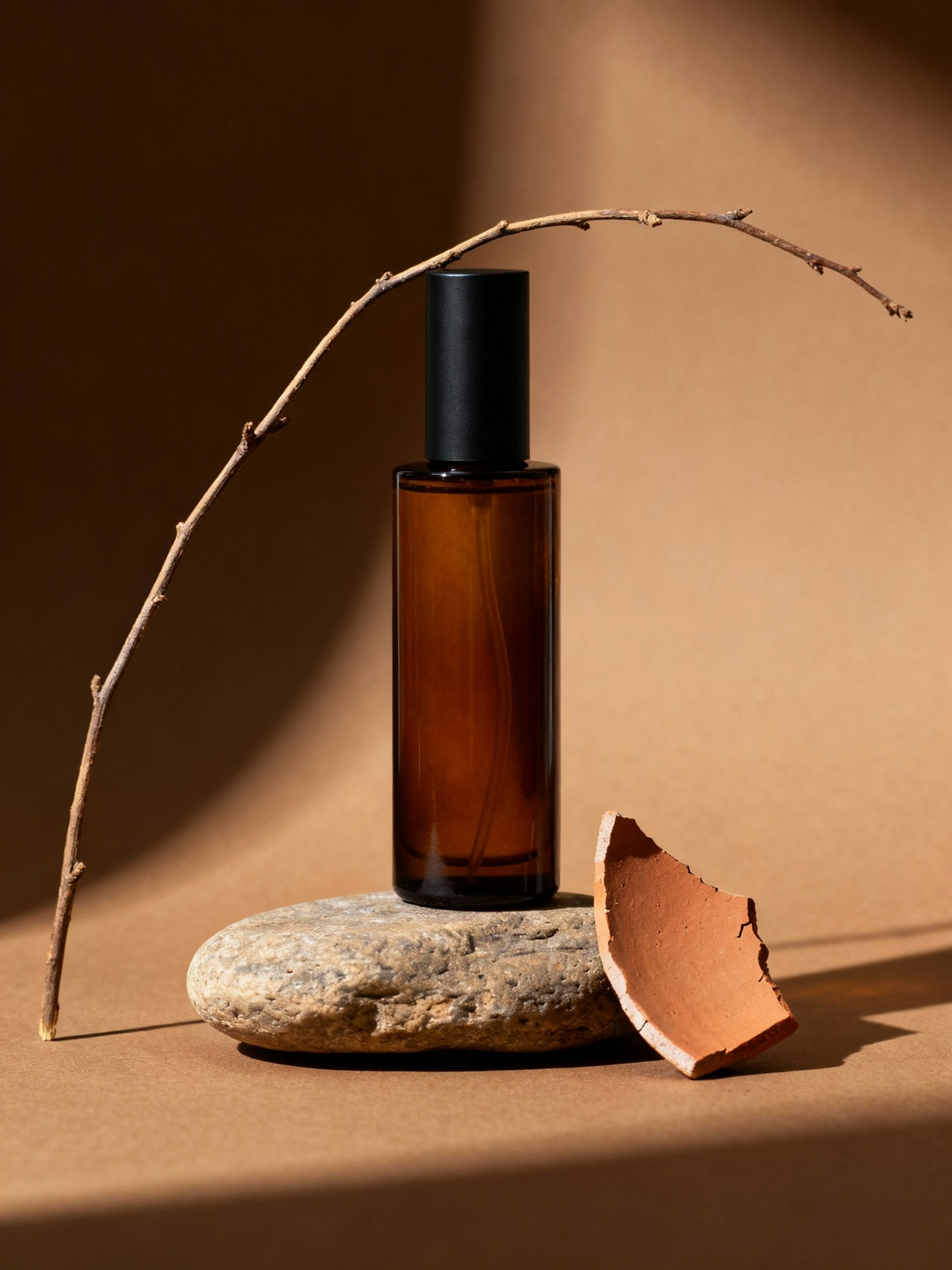 Studio product photography in a refined, sculptural, and organic art direction — matte amber glass packaging with a black lid, minimalist and label-free, placed against a warm brown studio background. The lighting is soft, directional, and diffused from one side, creating gentle shadows and a natural sense of depth. The overall atmosphere is earthy and calm, with warm tones, tactile textures, and a poetic balance between raw materials and crafted elegance. Style inspired by high-end skincare campaigns — natural sophistication, sensory minimalism, and sculptural composition. A tall amber bottle with a black cap standing upright on a flat rock, with a thin dried branch arching above it and a cracked piece of clay leaning against the base. The setup feels architectural yet organic, with delicate shadow play on the brown background.