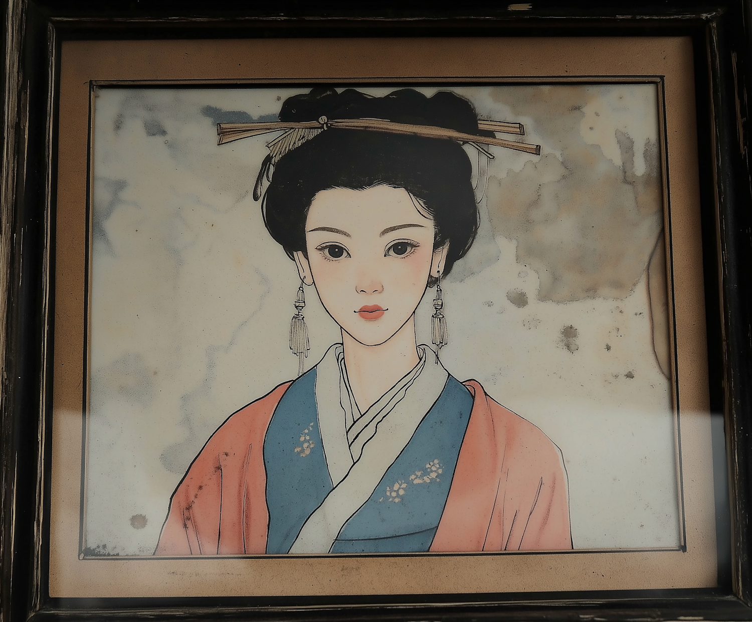 Traditional illustration of an Asian woman in elegant attire with ornate hairpins and earrings, framed in a classic wooden frame.
