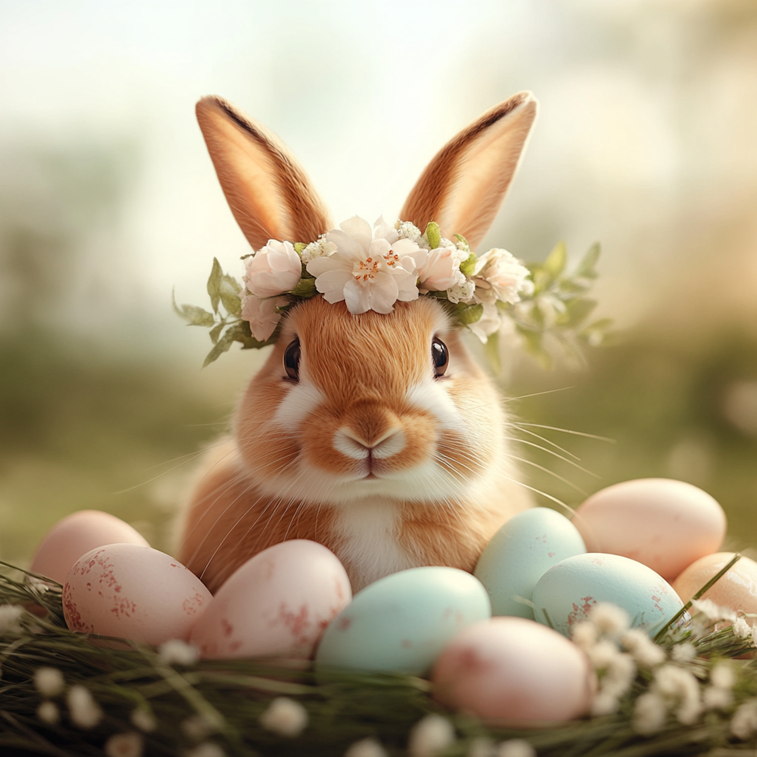 Adorable bunny with a floral crown surrounded by pastel Easter eggs in a grassy nest, perfect for springtime vibes.