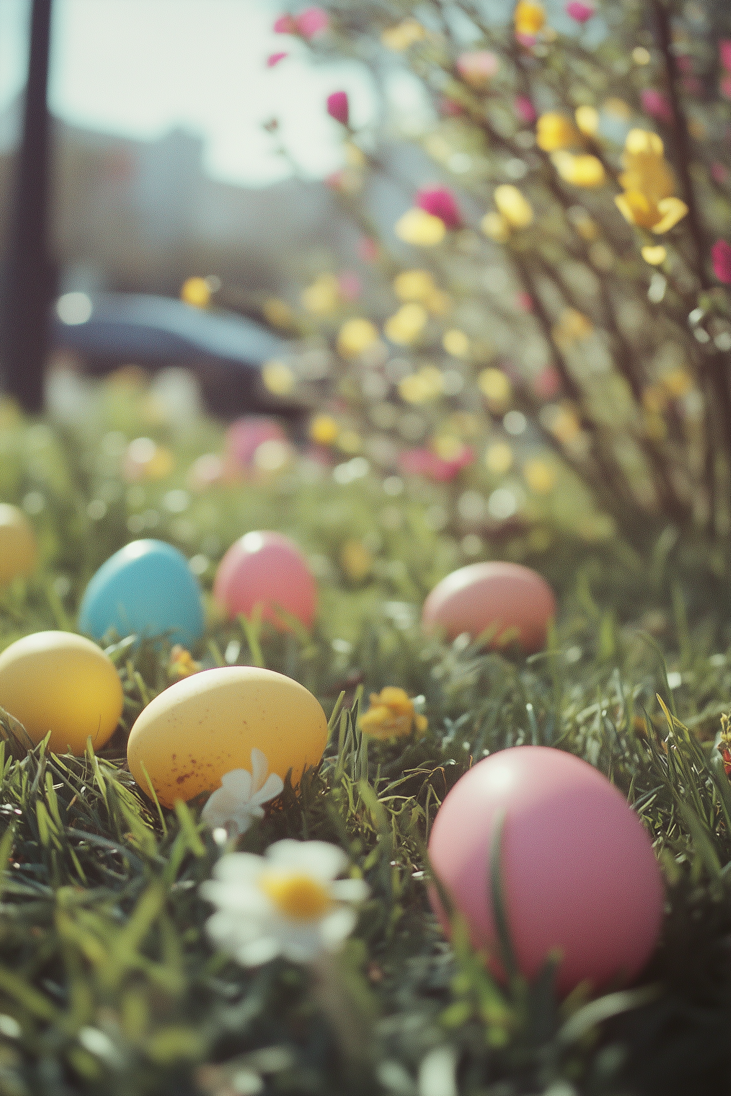 Colorful Easter eggs on a grassy lawn with daisies and spring blossoms in a sunny, festive outdoor setting.