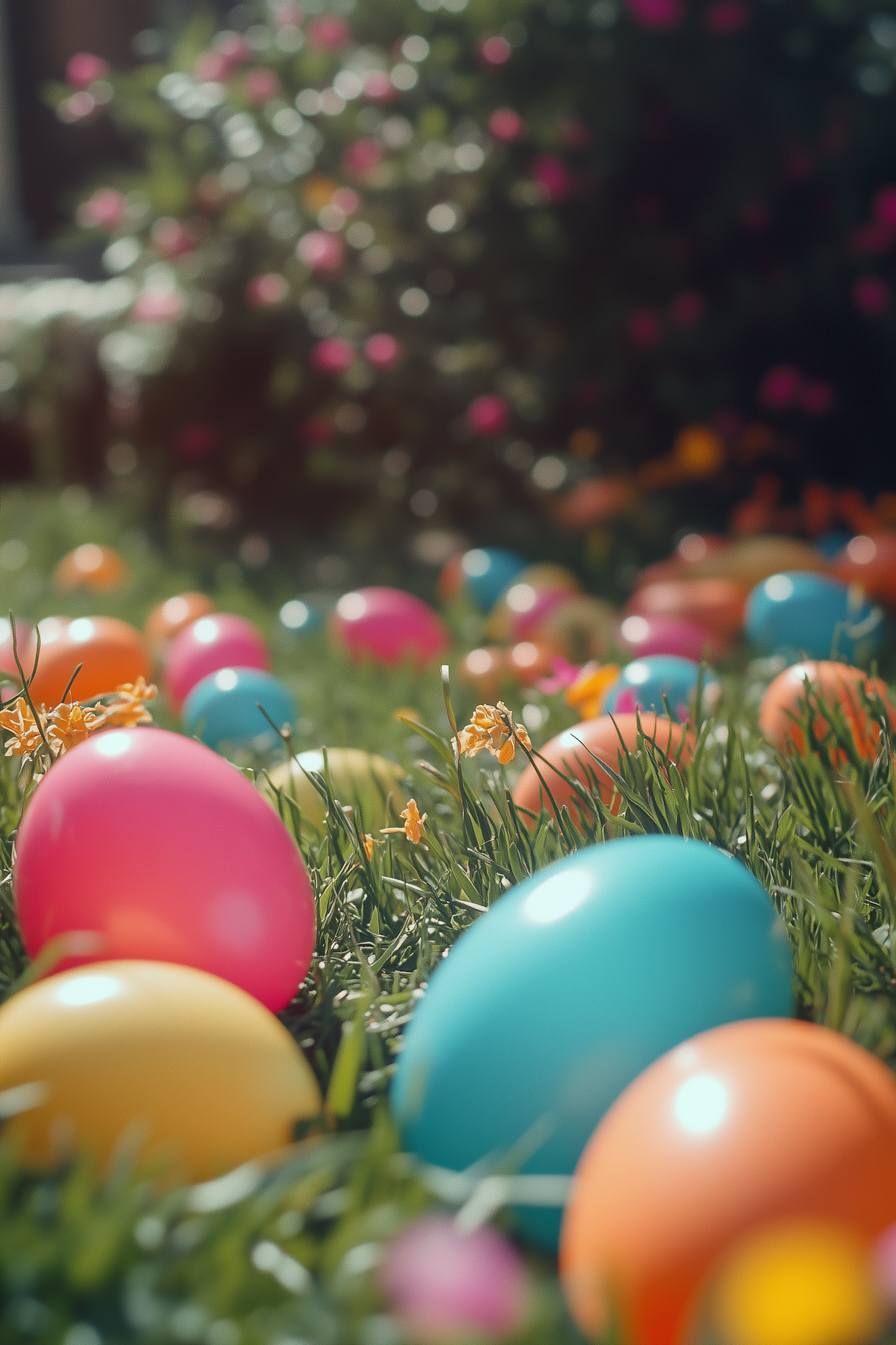 Vibrant Easter eggs scattered on a green lawn with yellow flowers and a blurred garden backdrop, evoking a festive springtime vibe.