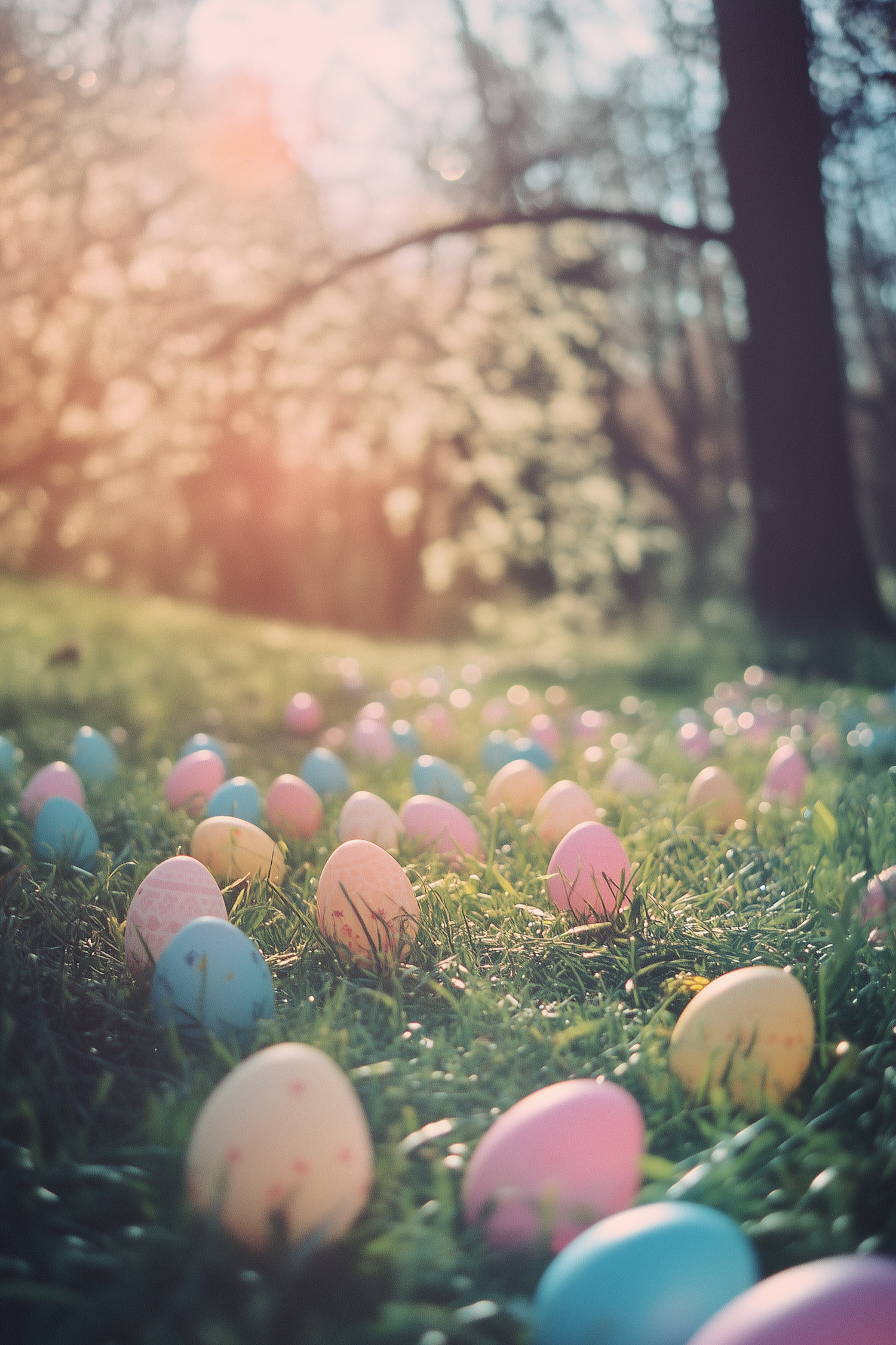 A sunlit meadow filled with colorful Easter eggs in pastel shades, creating a festive springtime atmosphere.