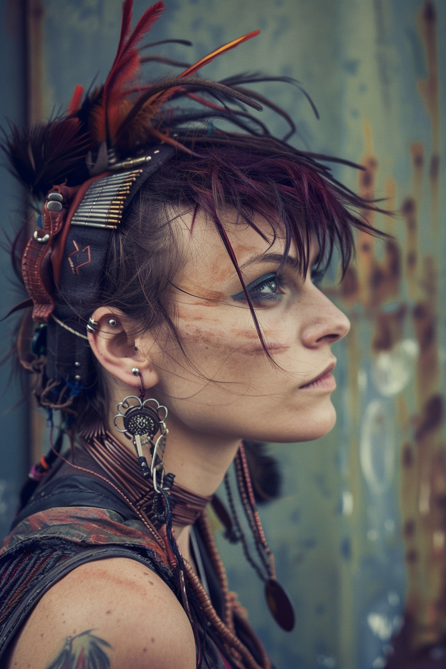 Punk-inspired woman with mohawk, feathers, and bullet casings, wearing tribal makeup and leather in an industrial setting.