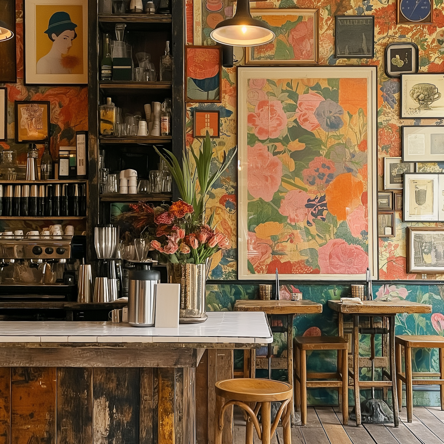 Cozy café with vibrant floral wallpaper, rustic wooden furniture, and eclectic art. Warm lighting enhances the inviting atmosphere.