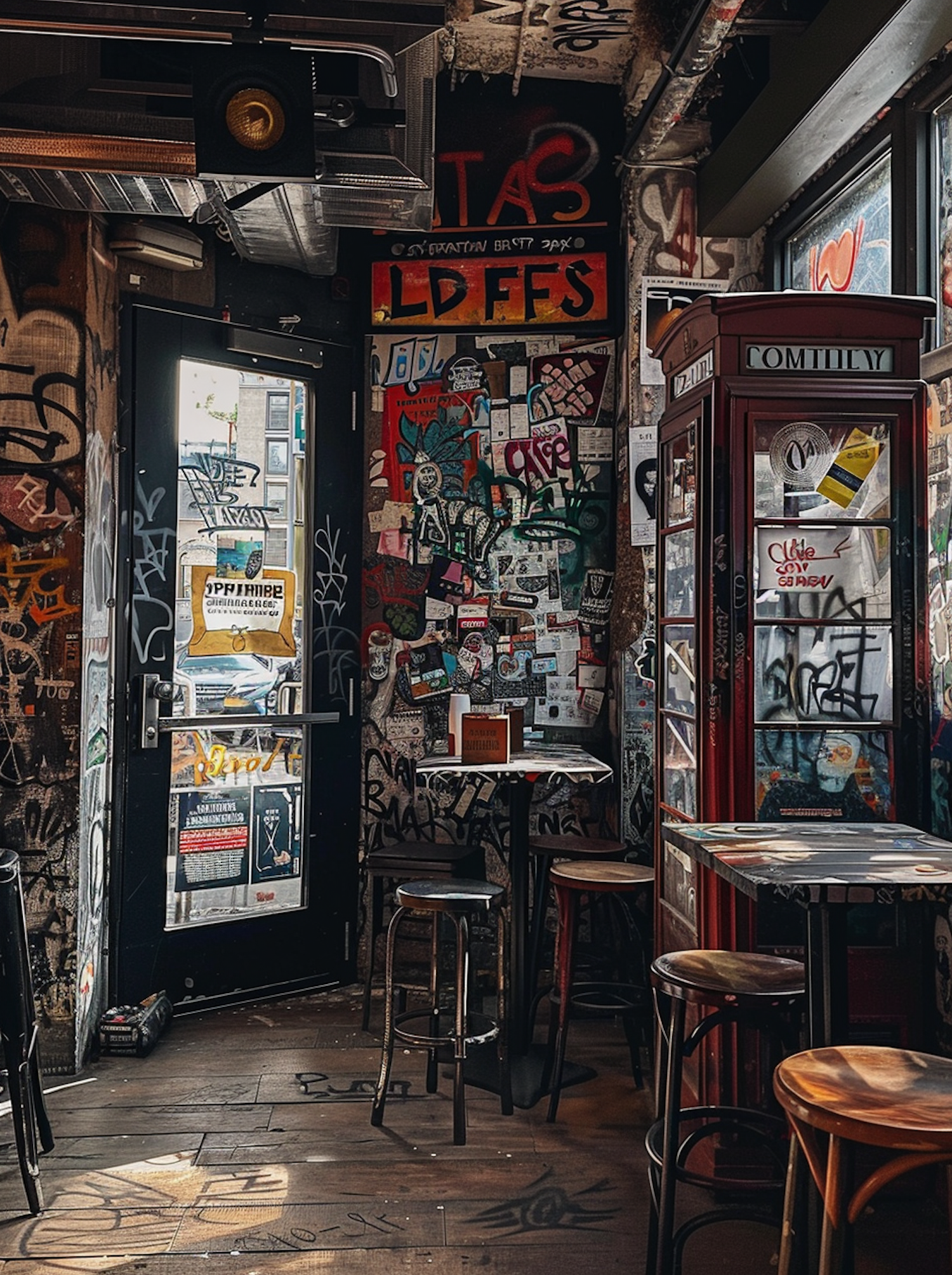 Urban cafe with graffiti-covered walls, a red phone booth, and high tables. A gritty, artistic atmosphere with warm lighting.
