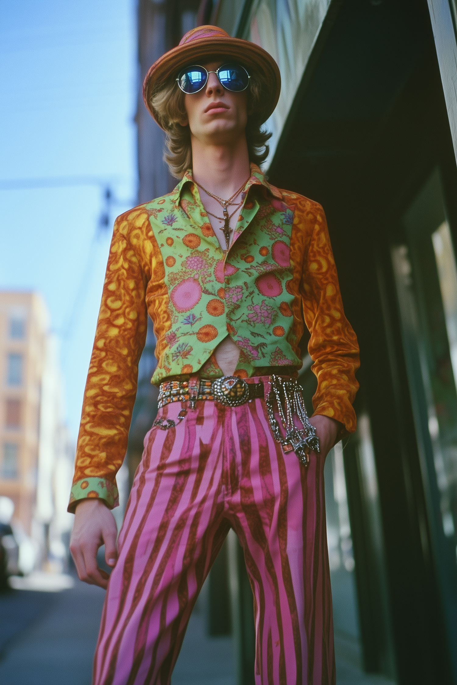 Retro 70s fashion with vibrant patterns and bold accessories on a city street. Stylish hat, sunglasses, and chain belt complete the look.