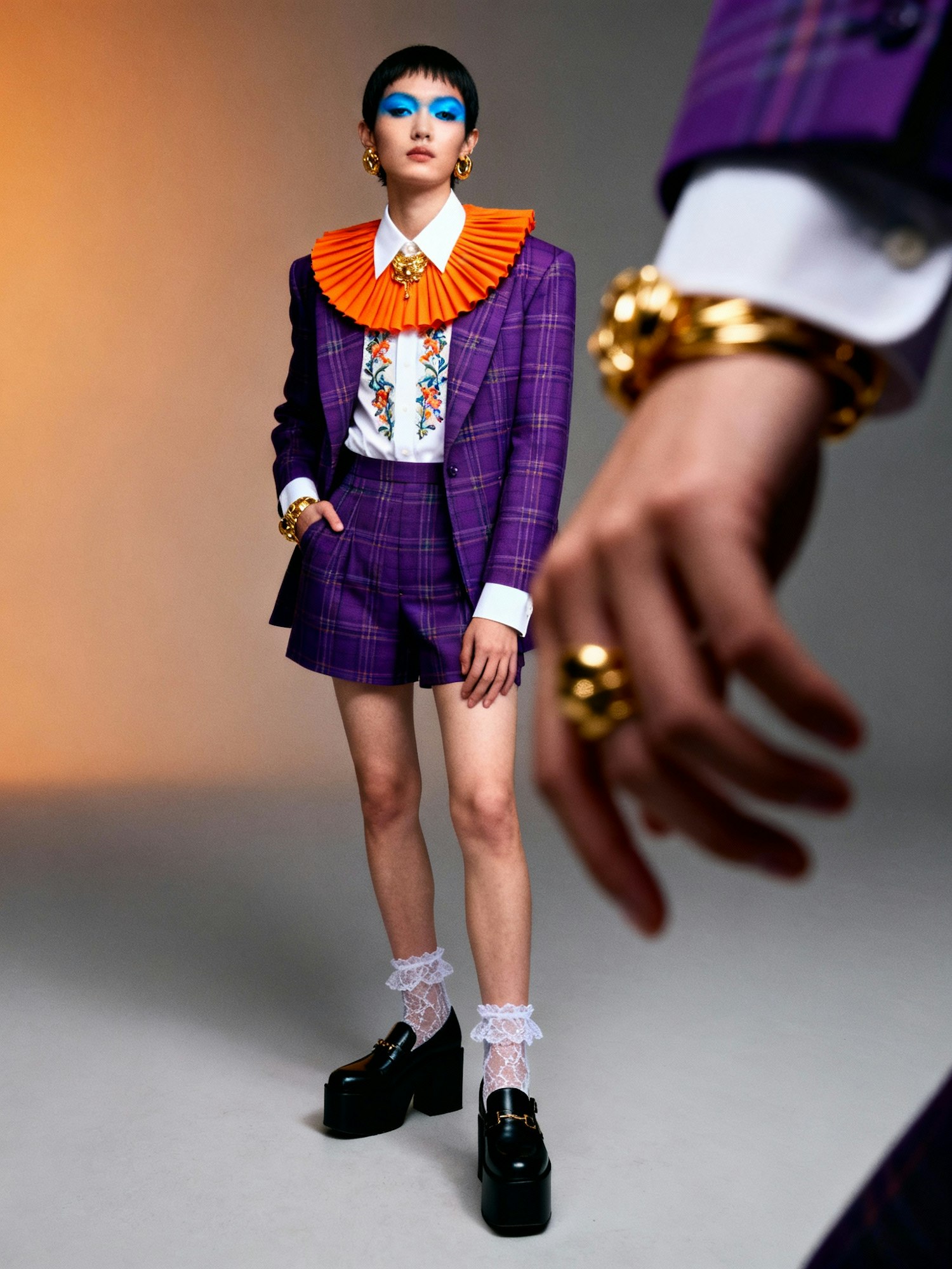 Avant-garde fashion portrait of a confident individual with glowing skin and vivid blue eyeshadow. They wear a purple plaid outfit layered over a white shirt with an orange pleated collar and detailed embroidery. Gold accessories, black platform shoes, and lace socks complete the ensemble. Captured with soft, cinematic lighting against a warm gradient background that fades to grey, highlighting rich textures and modern style. Editorial, creative, and visually refined.