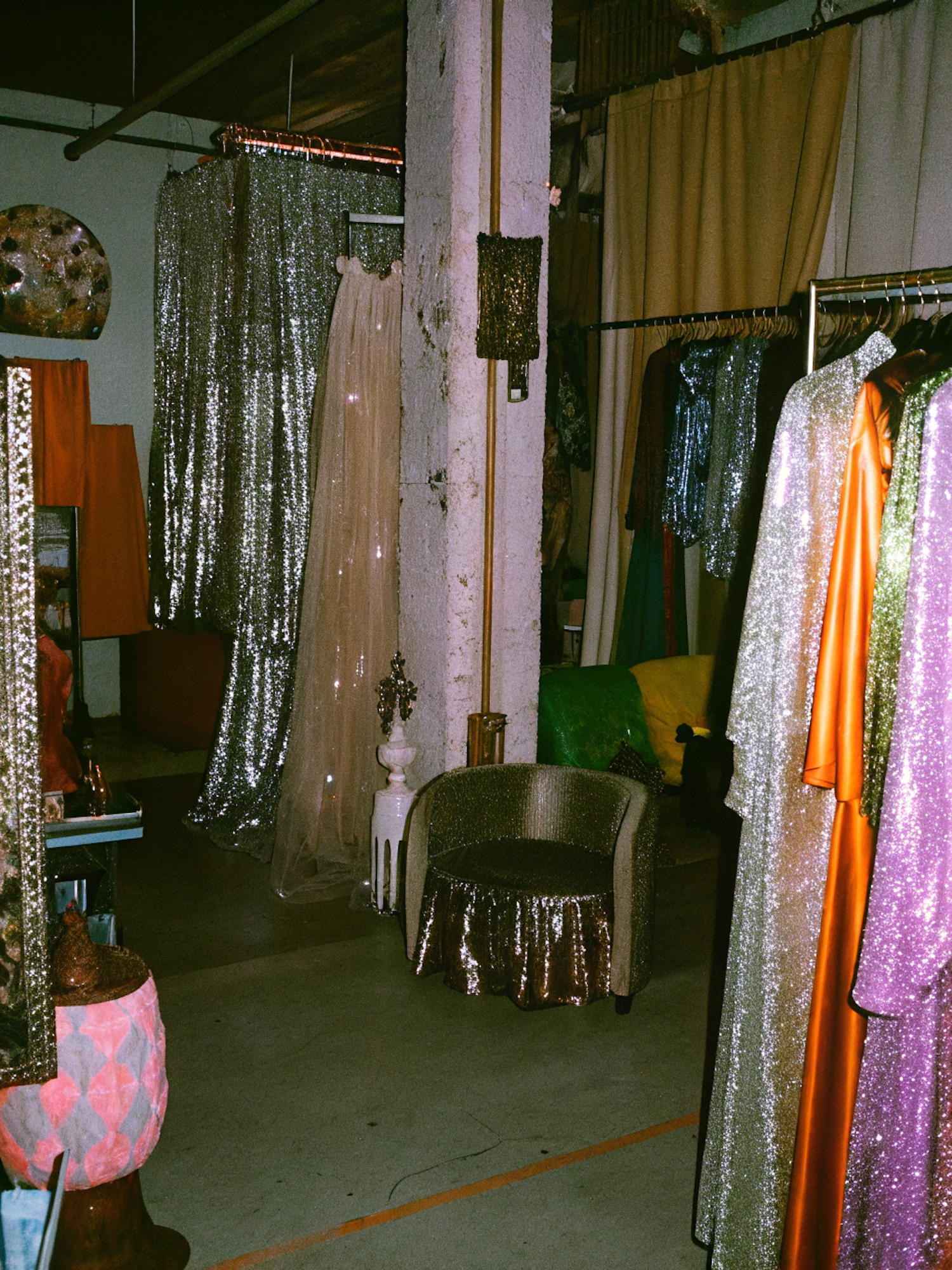A cozy, artistic space with glittering fabrics, sequined garments, and a metallic armchair. Perfect for lovers of bold, shiny decor.