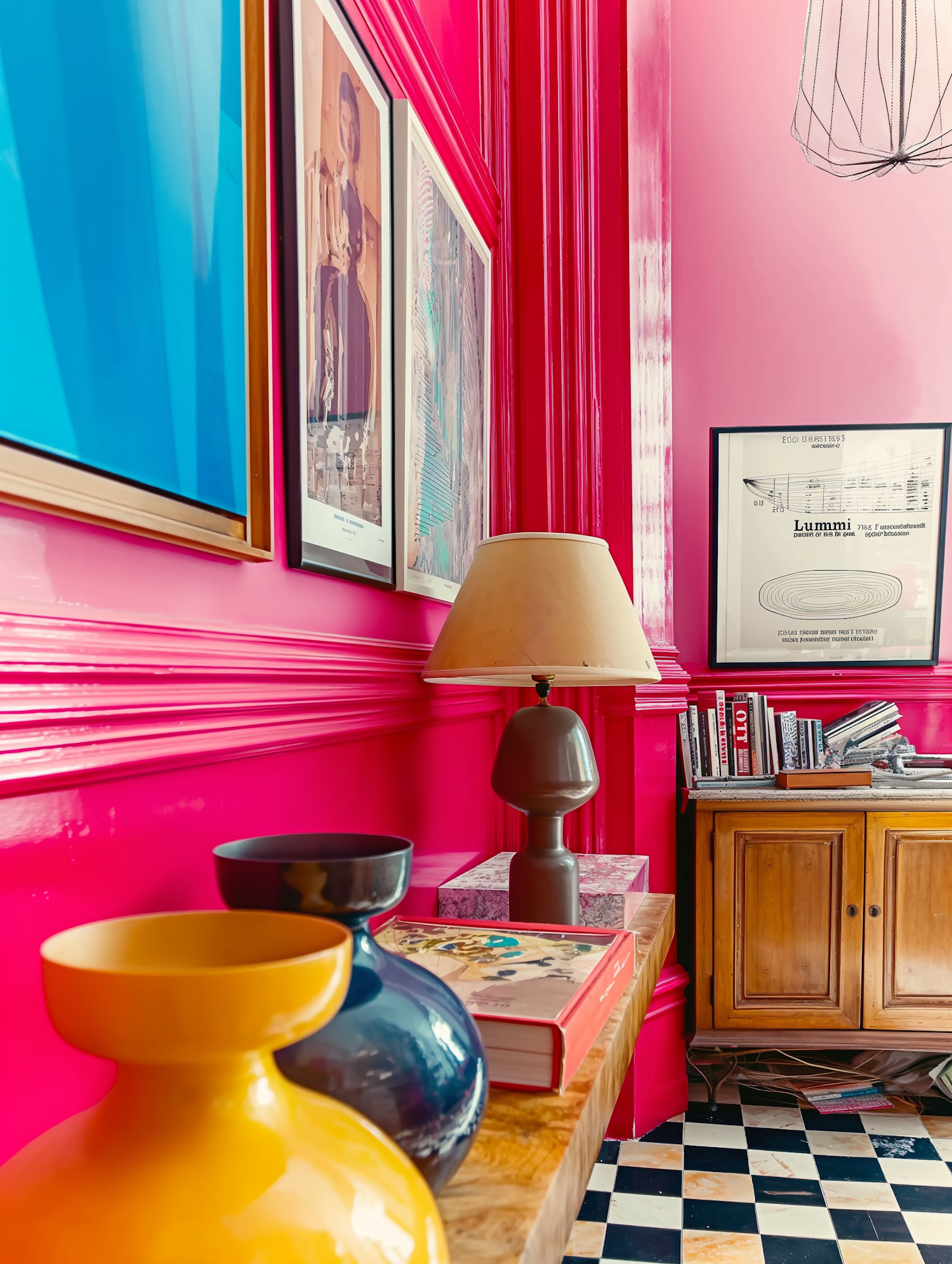 Vibrant pink wall with eclectic art, colorful vases, and a modern lamp. Wooden cabinet and checkered floor add a classic touch.