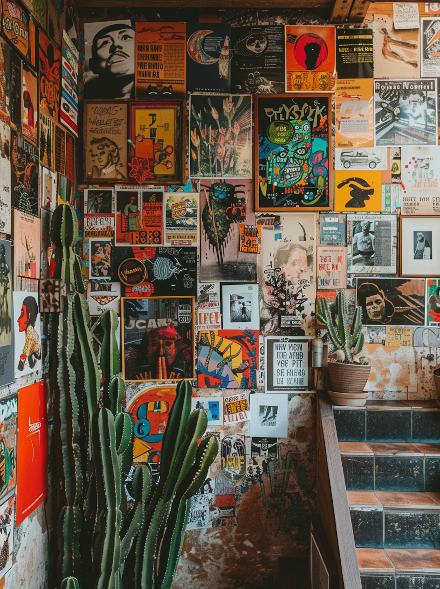 Eclectic wall of colorful posters and art with tall cacti and a tiled staircase, creating a vibrant and artistic atmosphere.
