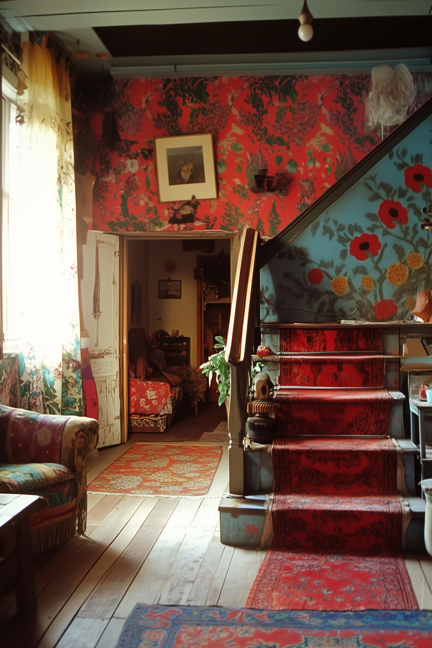 Eclectic interior with vibrant floral wallpaper, vintage decor, and a cozy, artistic atmosphere. Features a wooden staircase and colorful rugs.