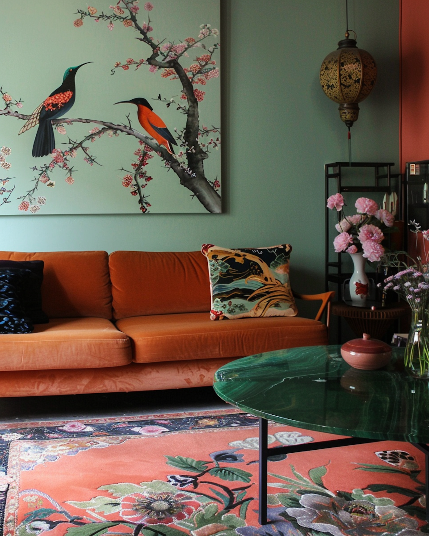 Stylish living room with orange sofa, bird painting, green marble table, and floral rug. Elegant decor with pink flowers and hanging lantern.