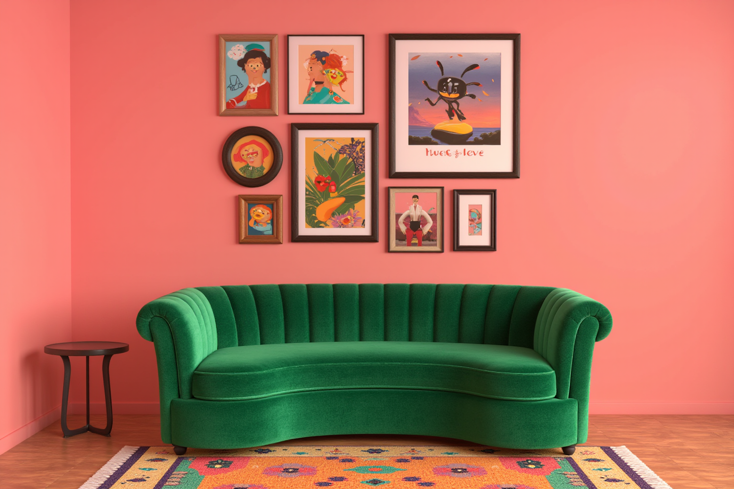 Bright living room with a green velvet sofa, coral walls, colorful framed art, and a vibrant patterned rug for a bold, artistic vibe.