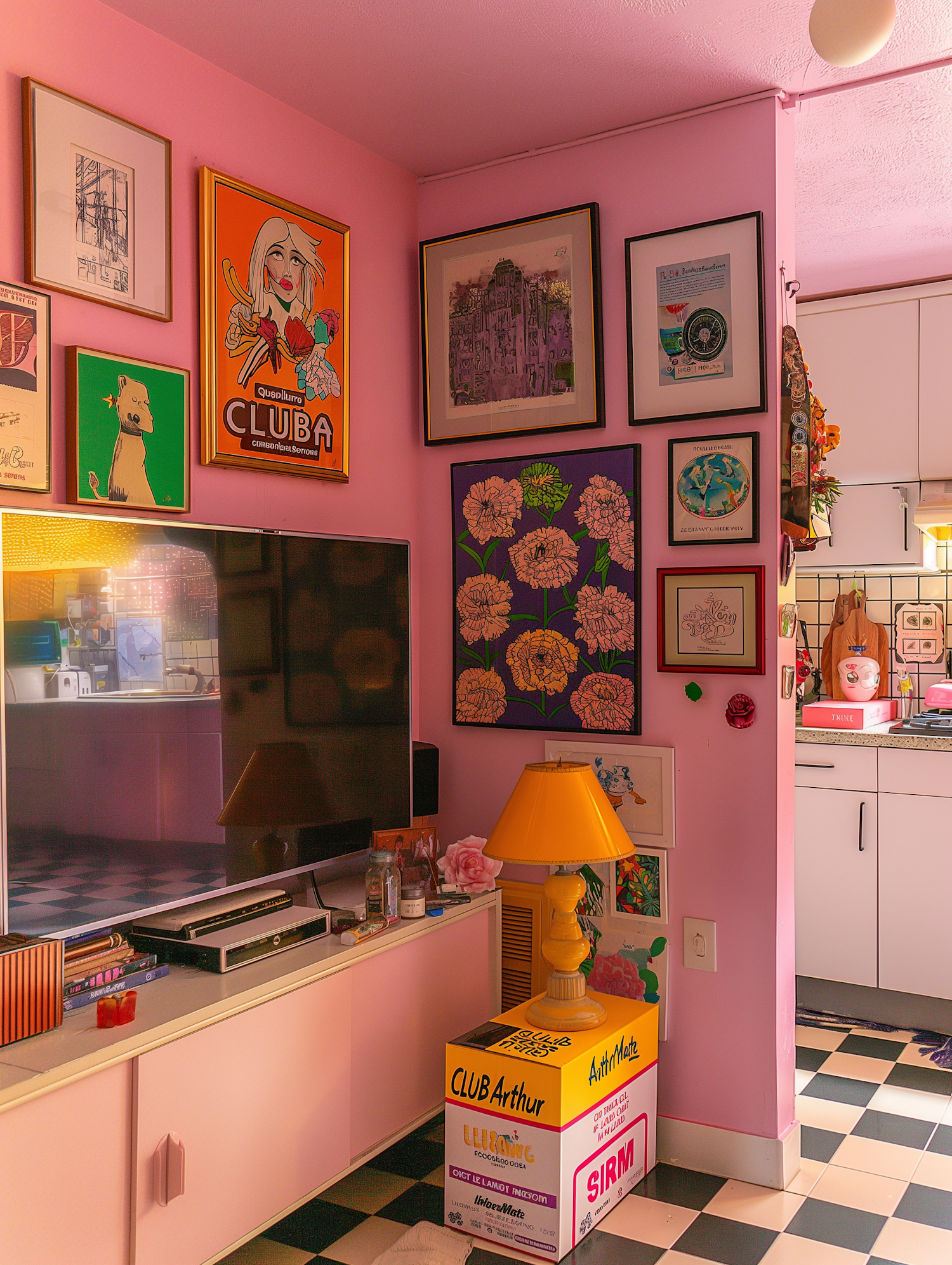 Retro pink room with eclectic art, yellow lamp, checkered floor, and a cozy kitchen in the background.