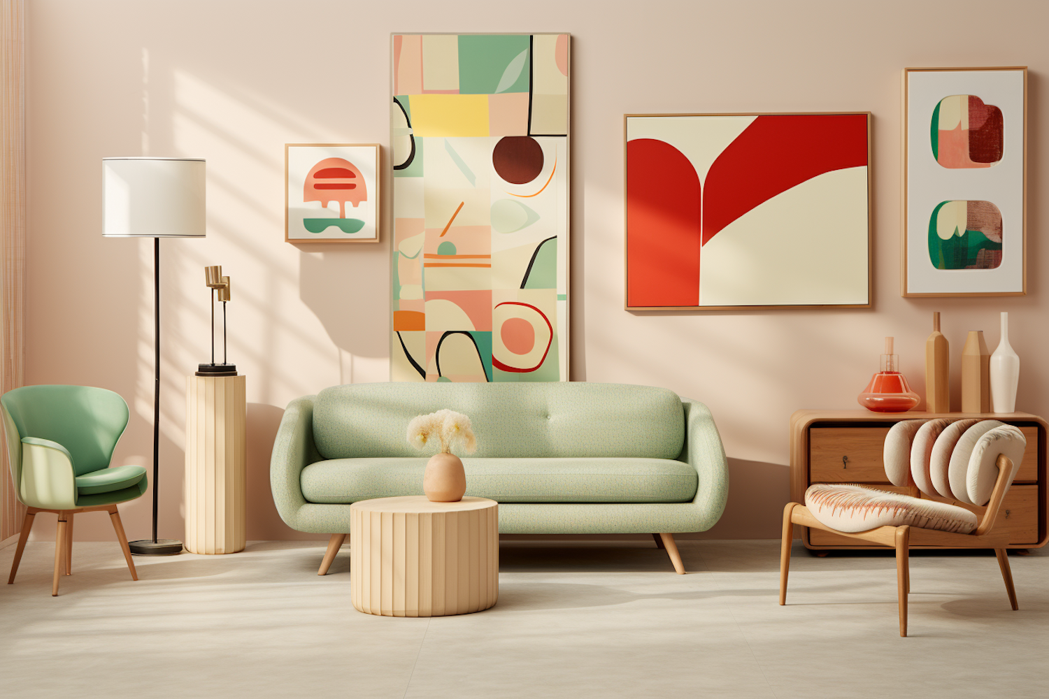 Modern living room with pastel furniture, abstract wall art, and mid-century design elements in a cozy, stylish setting.