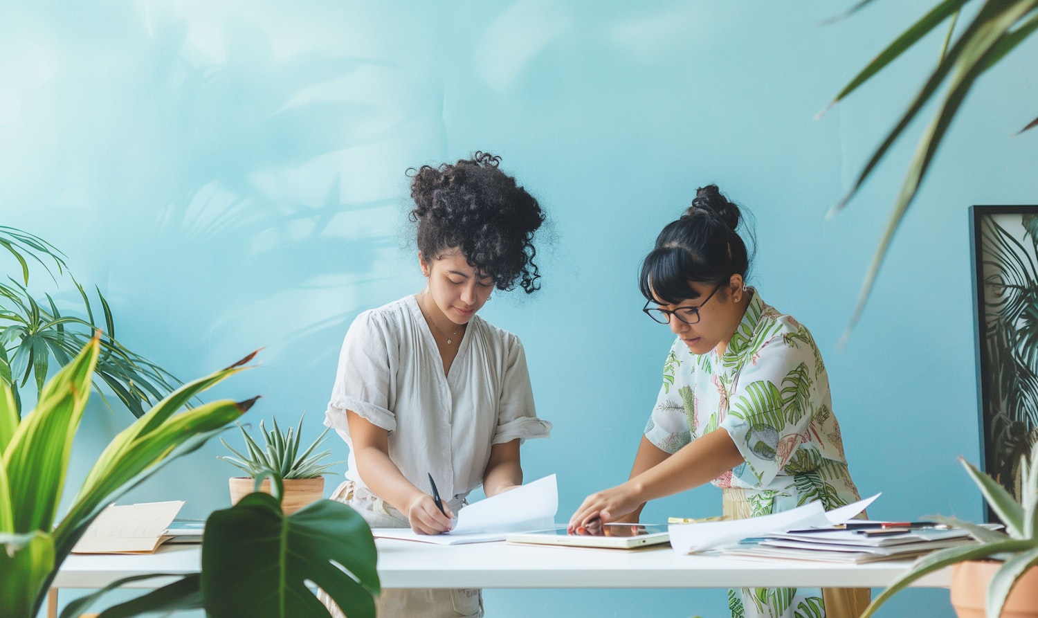 Two women collaborating at a desk with documents and plants, set against a soft blue background.