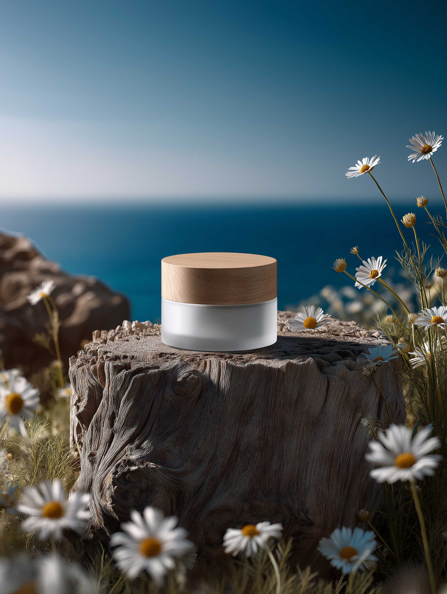 A frosted glass jar with a wooden lid sits on a tree stump surrounded by daisies, with a serene ocean view in the background.