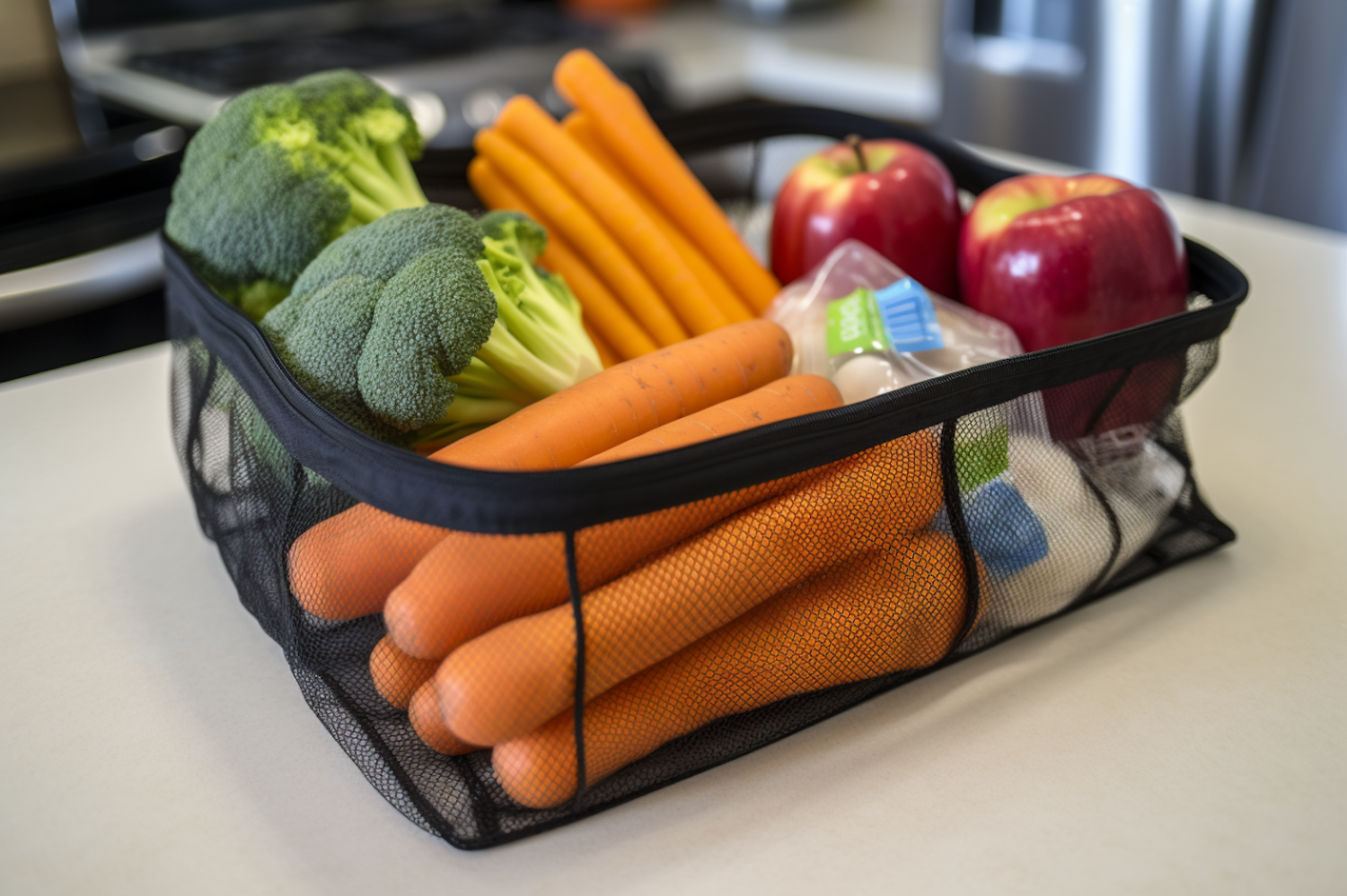 Mesh basket with fresh broccoli, carrots, and apples on a kitchen counter, highlighting healthy eating and vibrant colors.