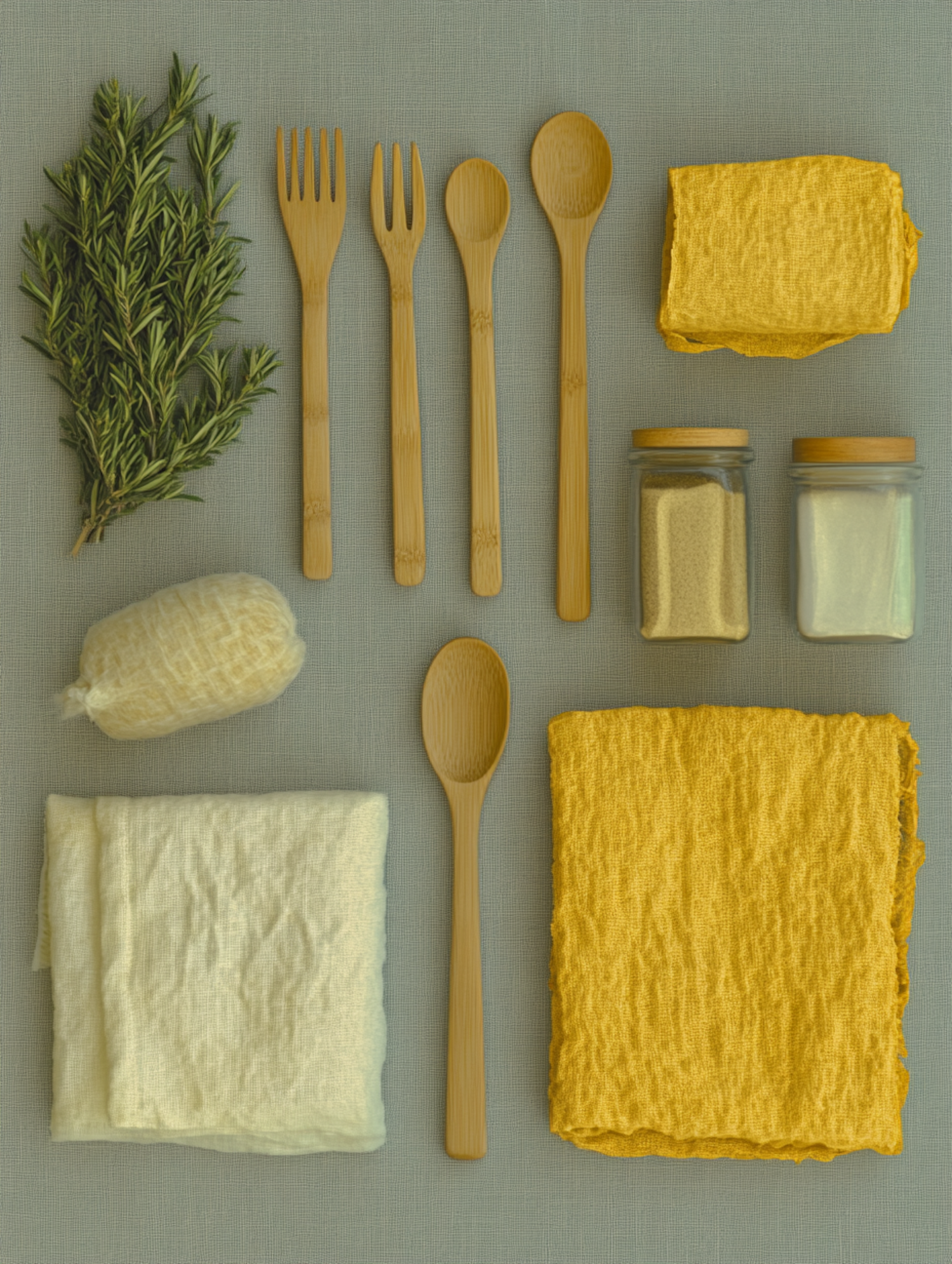 Eco-friendly kitchen flat lay with bamboo utensils, cloths, rosemary, and spice jars on a gray surface.