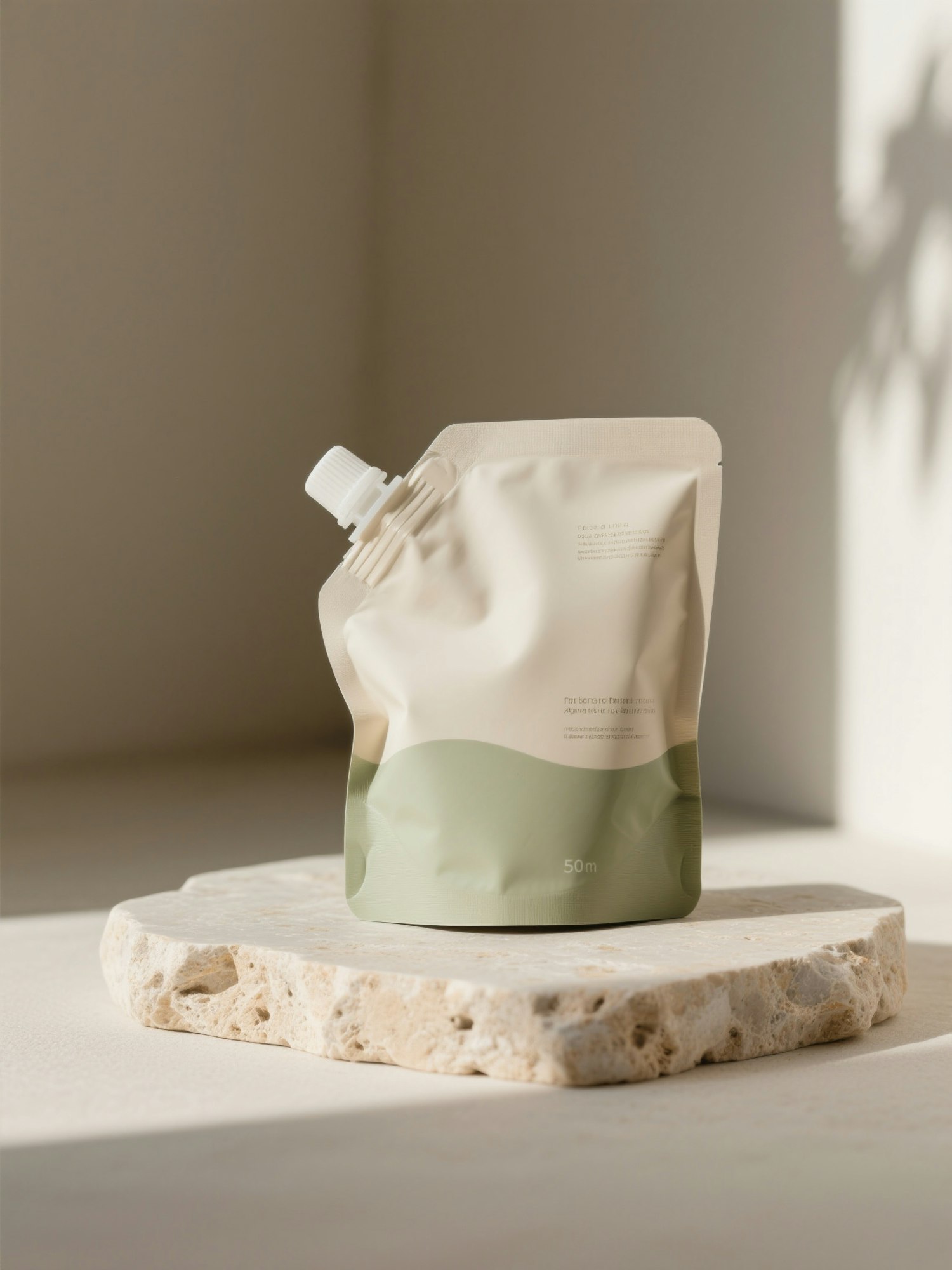 Minimalist beige and green pouch with spout cap on a stone slab, softly lit with plant shadows, emphasizing eco-friendly design.