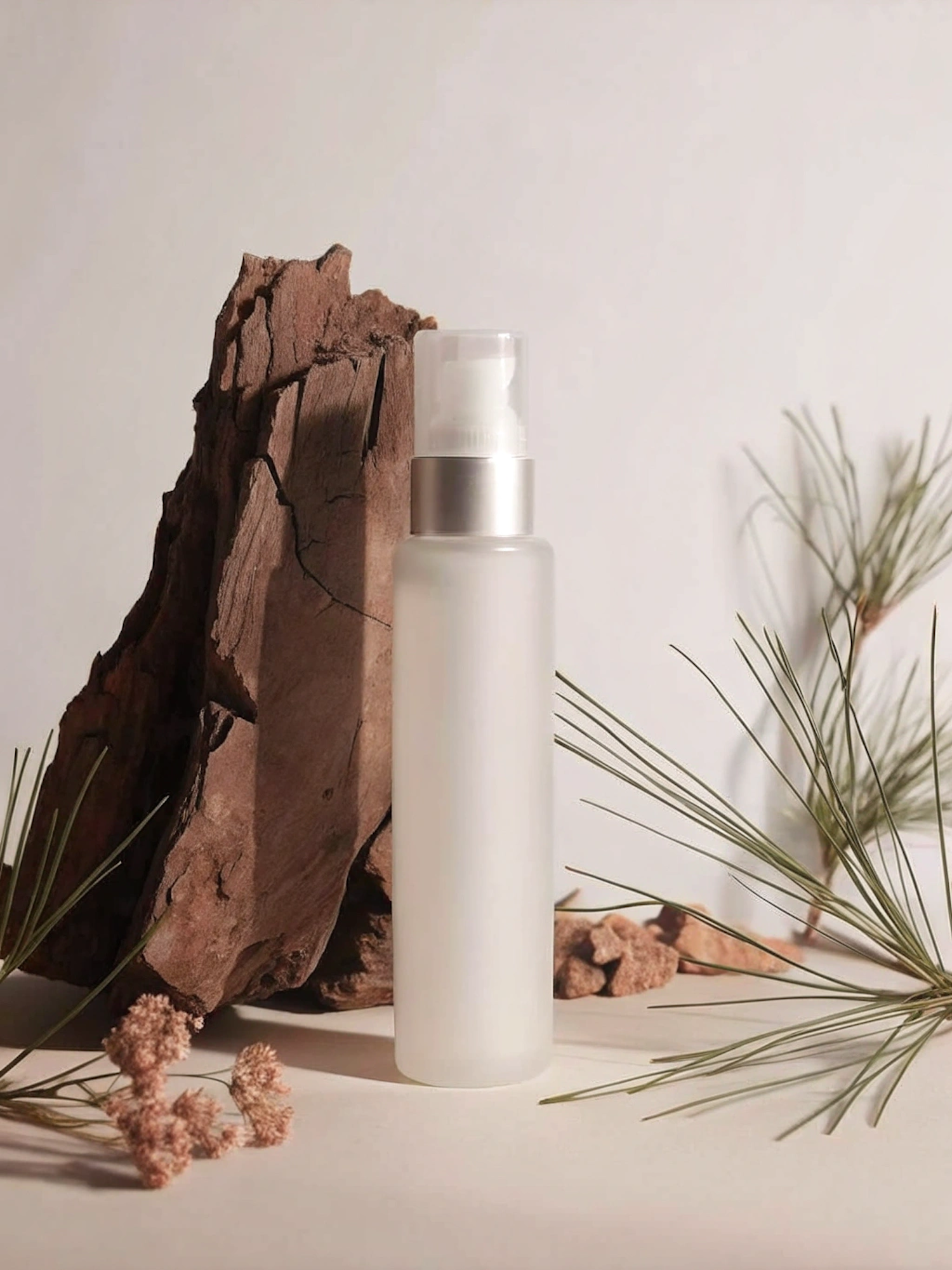 Frosted glass spray bottle with silver cap, styled with bark, pine needles, and dried flowers for a natural, minimalist aesthetic.