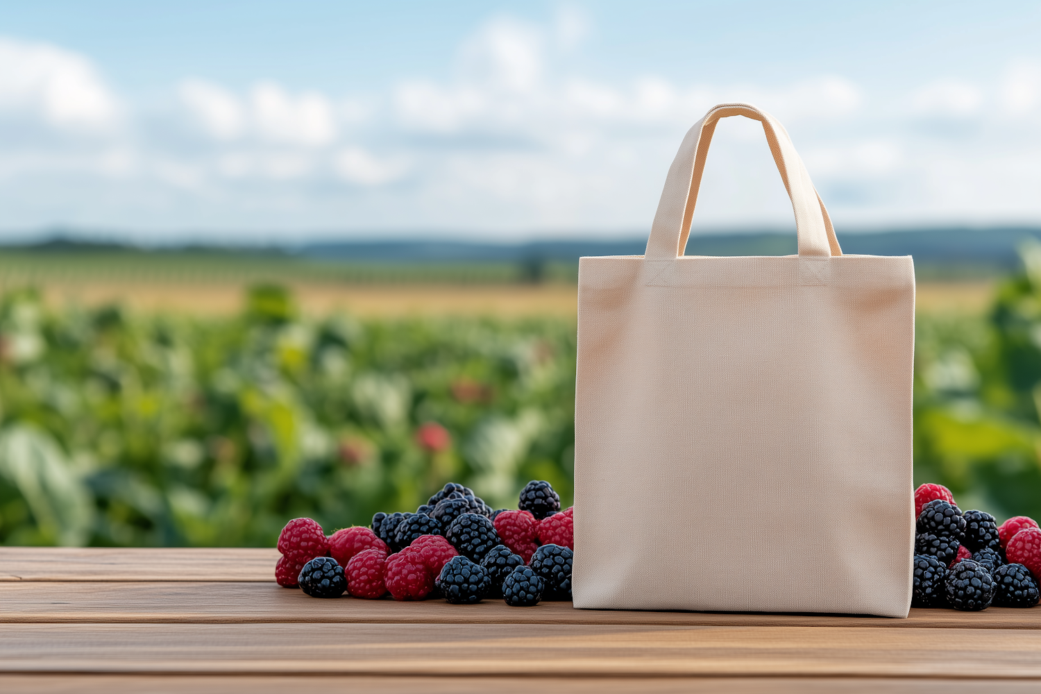 Canvas tote bag with fresh blackberries and raspberries on a wooden table, set against a blurred green field background.