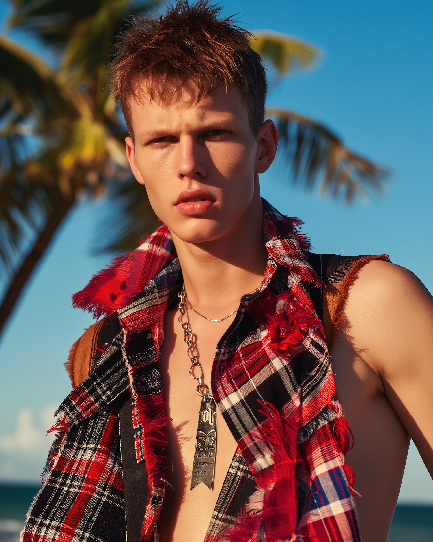 Young man in a frayed plaid shirt and chain necklace, standing under a blue sky with palm trees in the background.