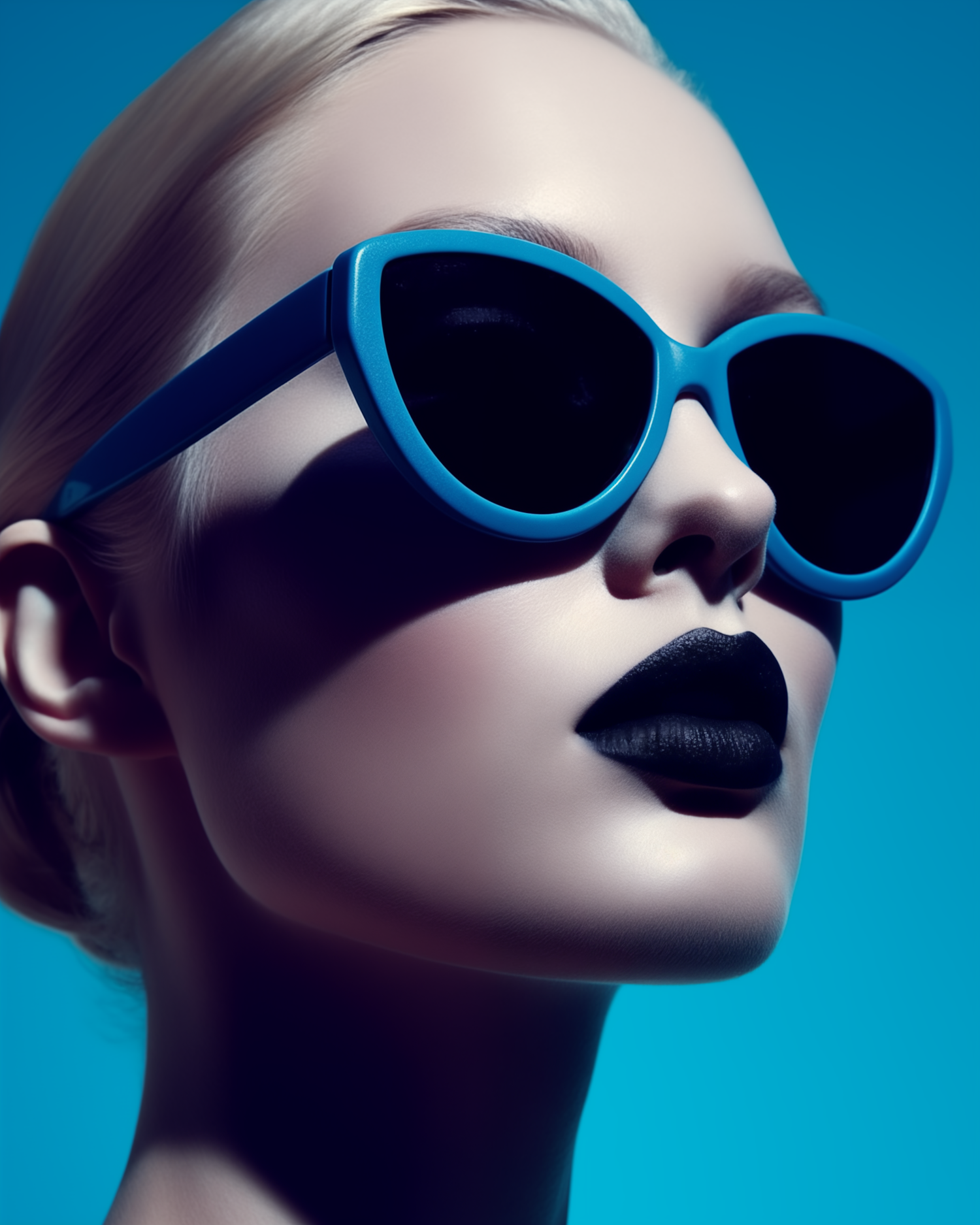 Close-up of a person with platinum blonde hair, blue cat-eye sunglasses, and black lipstick against a vibrant blue background.
