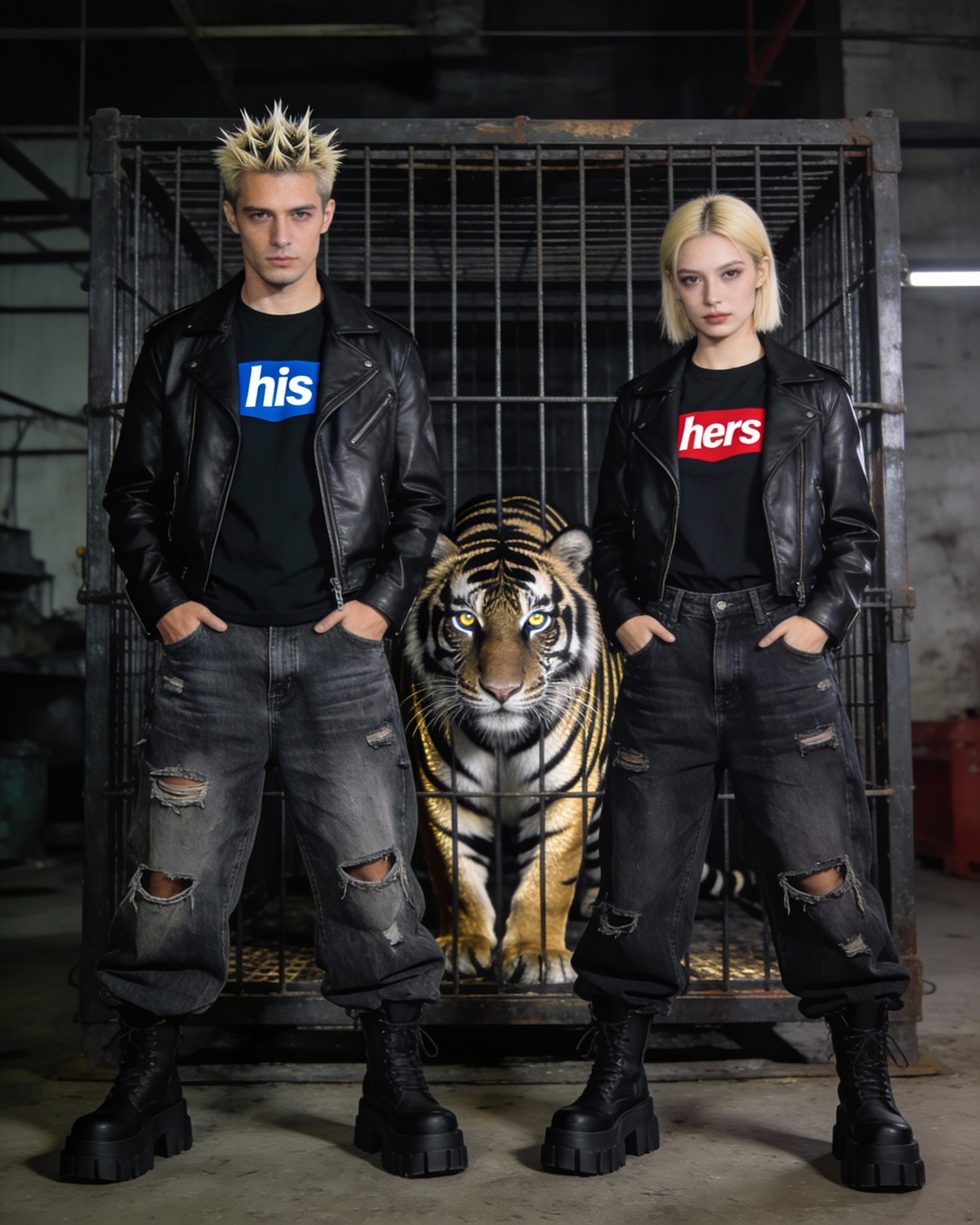 A man and a woman fashion model both with short, spiked blonde hair pose confidently in front of a cage with a tiger in the background. The individuals are dressed in a black leather jackets , and tshirts each with different color his and hers logos, baggy distressed jeans, paired with chunky black boots. The tiger with its striking black and gold stripes gazes directly at the camera, its intense eyes adding a dramatic urban element to the scene.