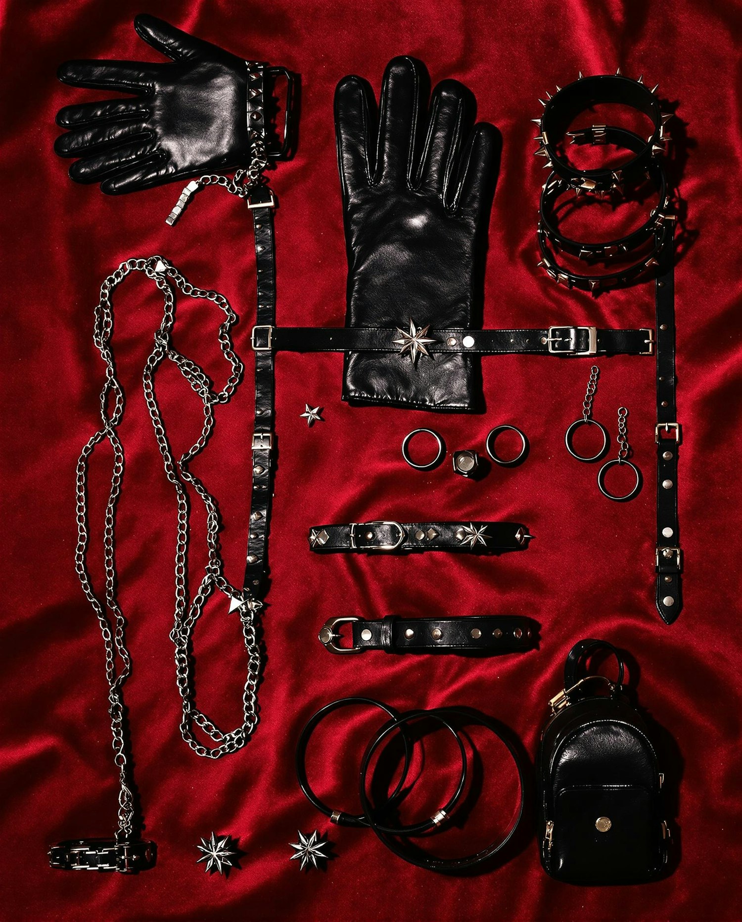 Black leather gloves and accessories against a red velvet background, featuring intricate metal detailing and a bold alternative theme.