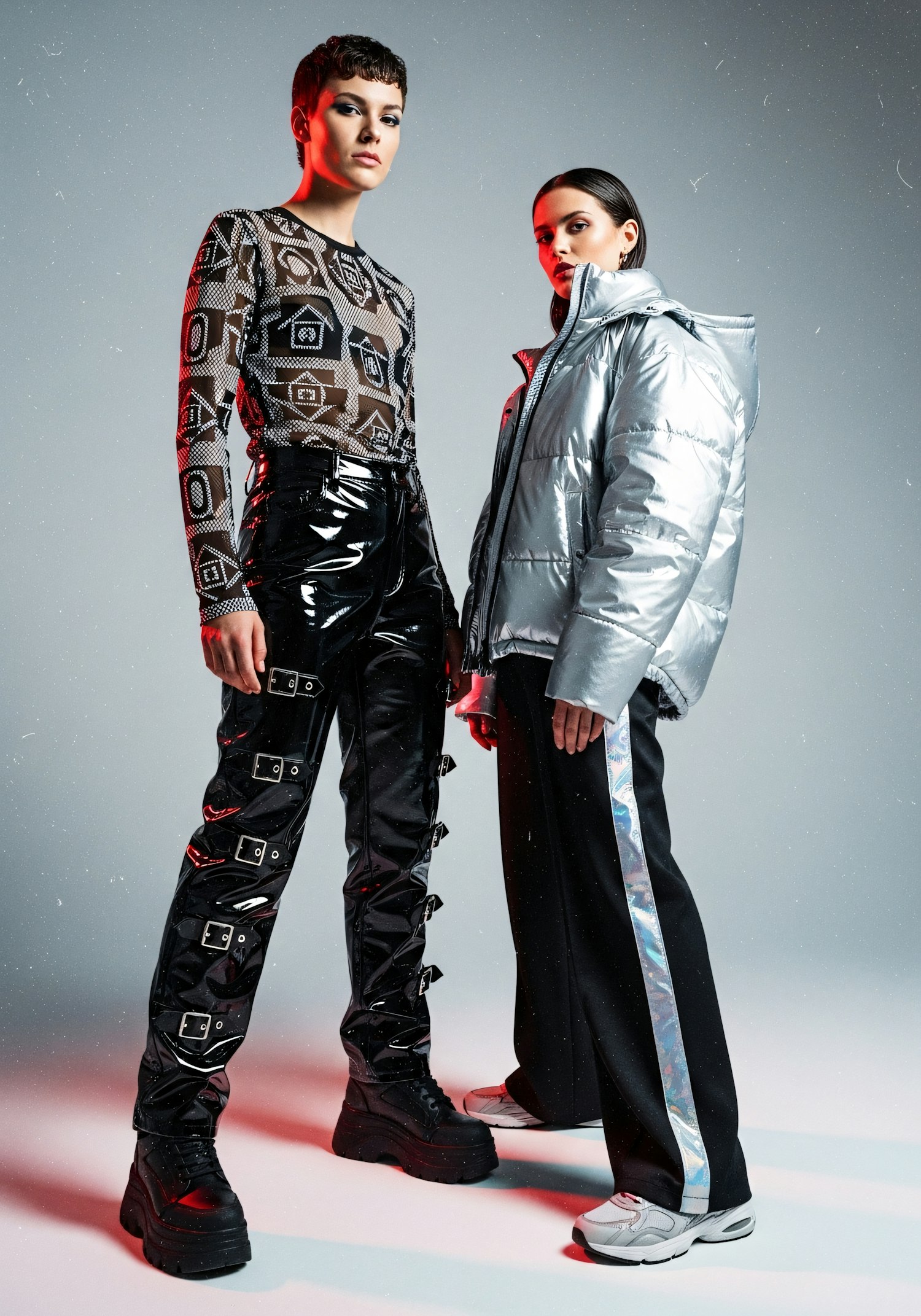 Two individuals in bold, modern outfits pose in a studio, showcasing edgy fashion with metallic and reflective elements.