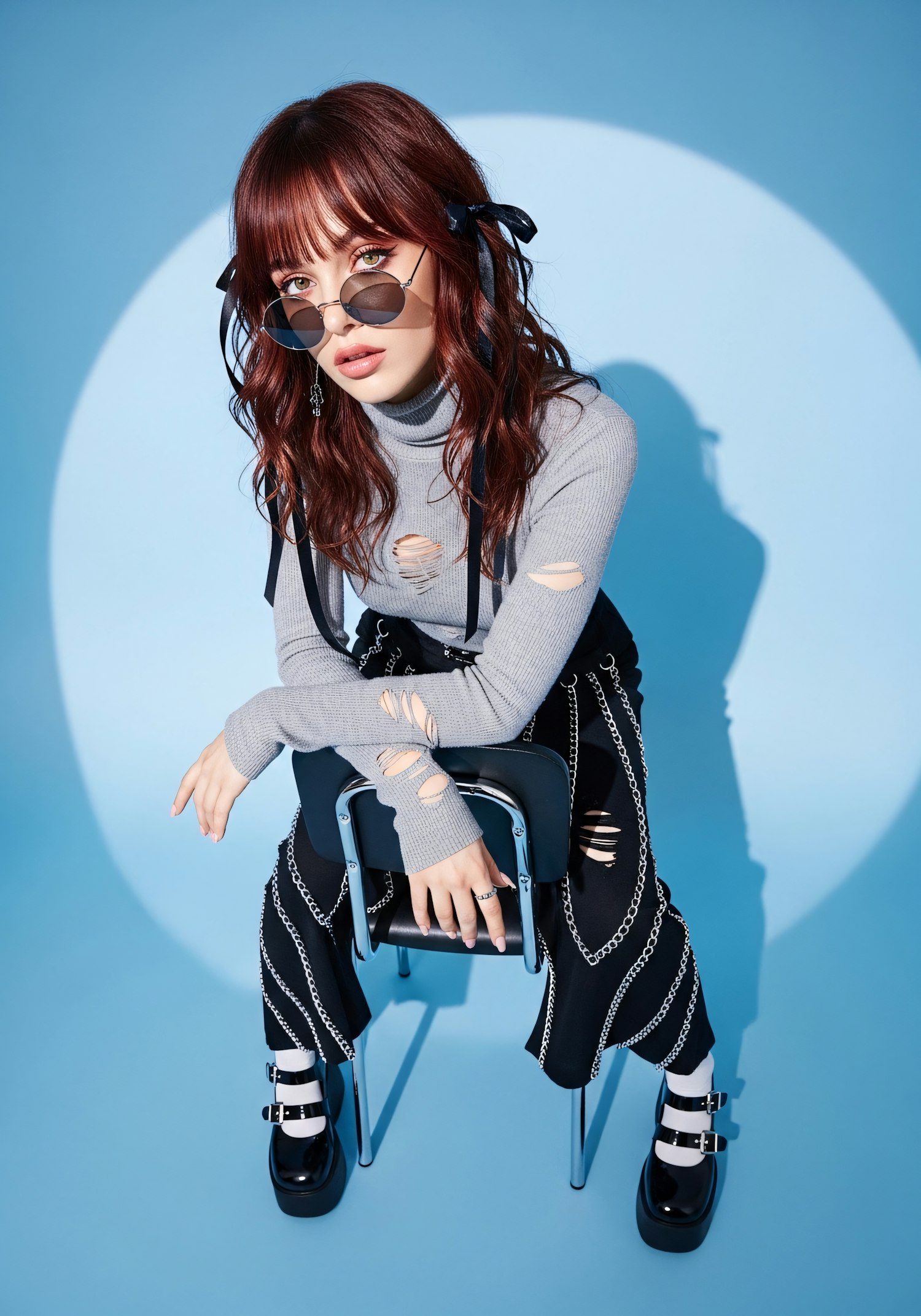 A fashionable person with red hair and edgy attire poses on a chair against a blue backdrop, showcasing a modern and bold style.