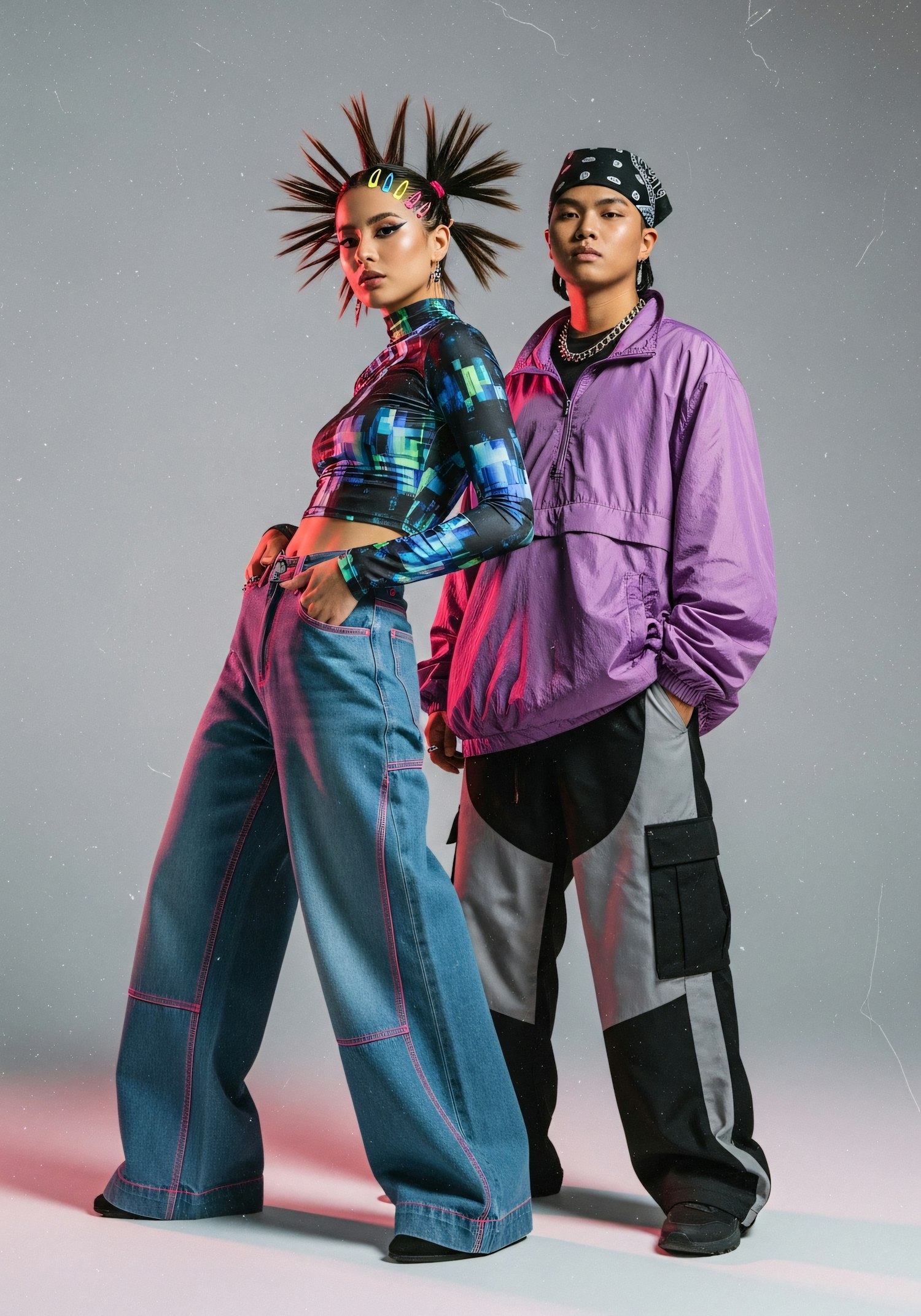 Two stylish individuals pose in bold, colorful outfits with dramatic lighting, showcasing modern and edgy fashion in a studio setting.