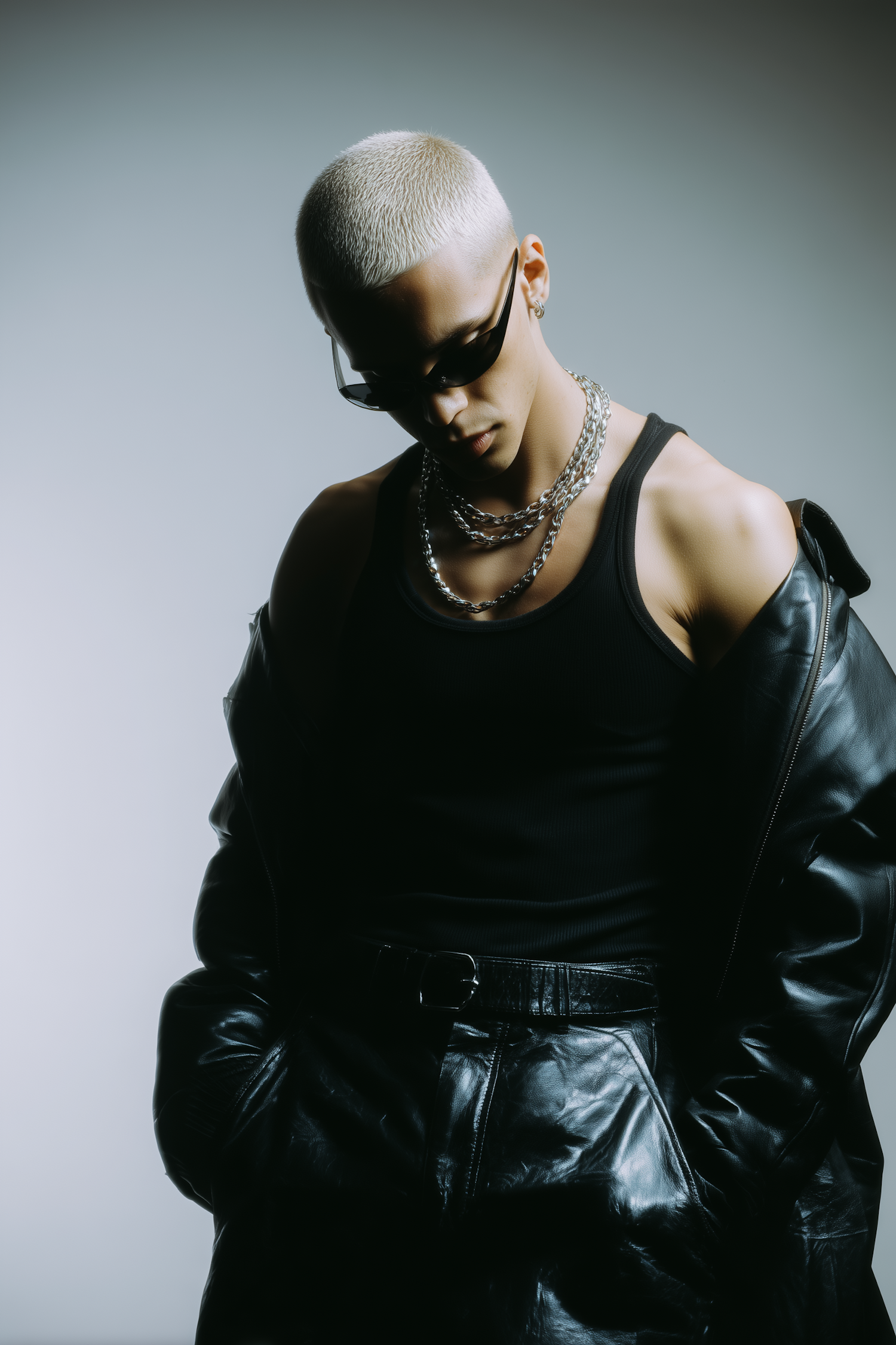 Stylish individual with platinum blonde hair, sunglasses, and leather outfit, accessorized with silver chains, exuding a bold, modern vibe.