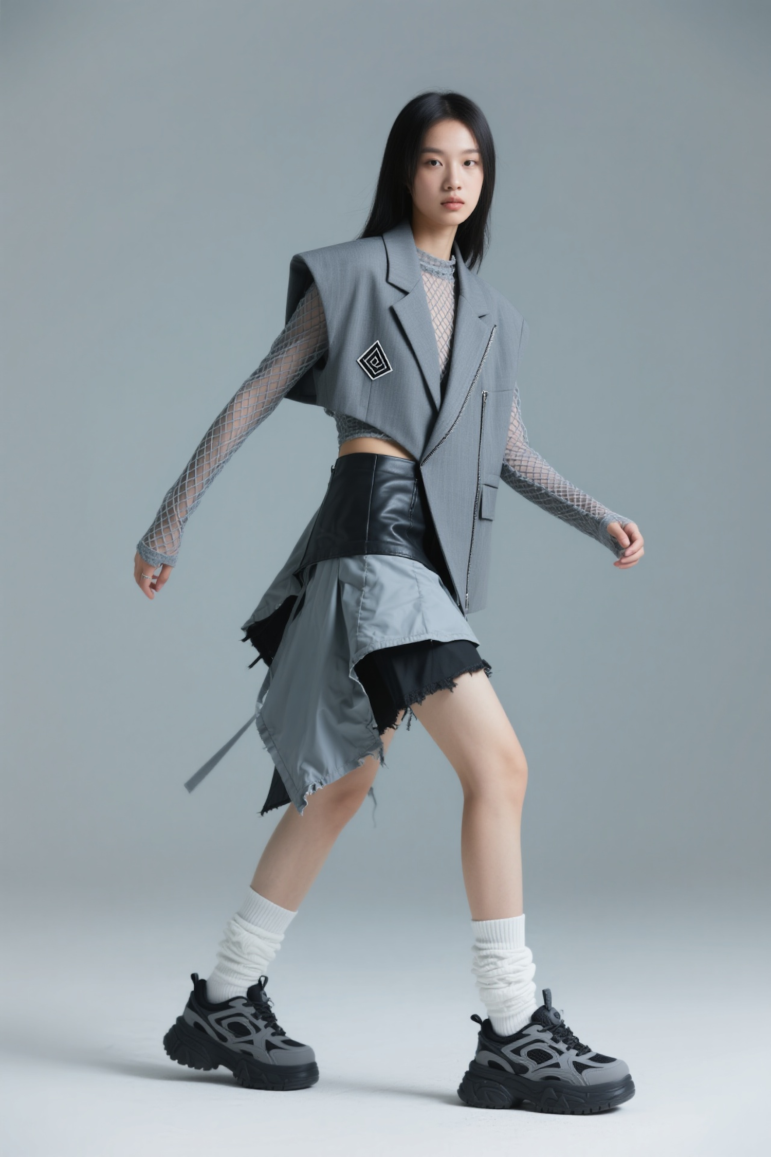Stylish young woman in a modern gray vest, mesh top, and asymmetrical skirt, paired with chunky sneakers and scrunched socks.