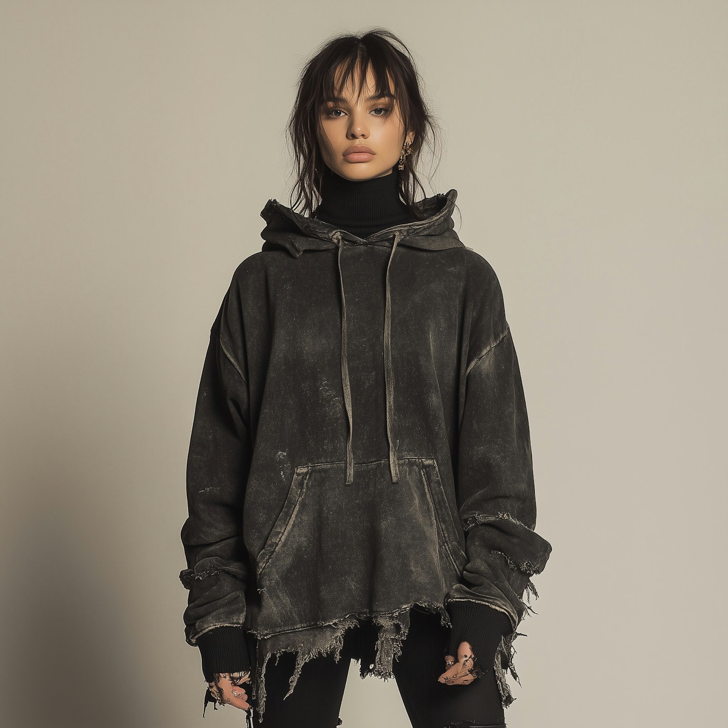 Edgy grunge look featuring a distressed black hoodie, layered with a turtleneck, and accessorized with gold hoops and black nail polish.