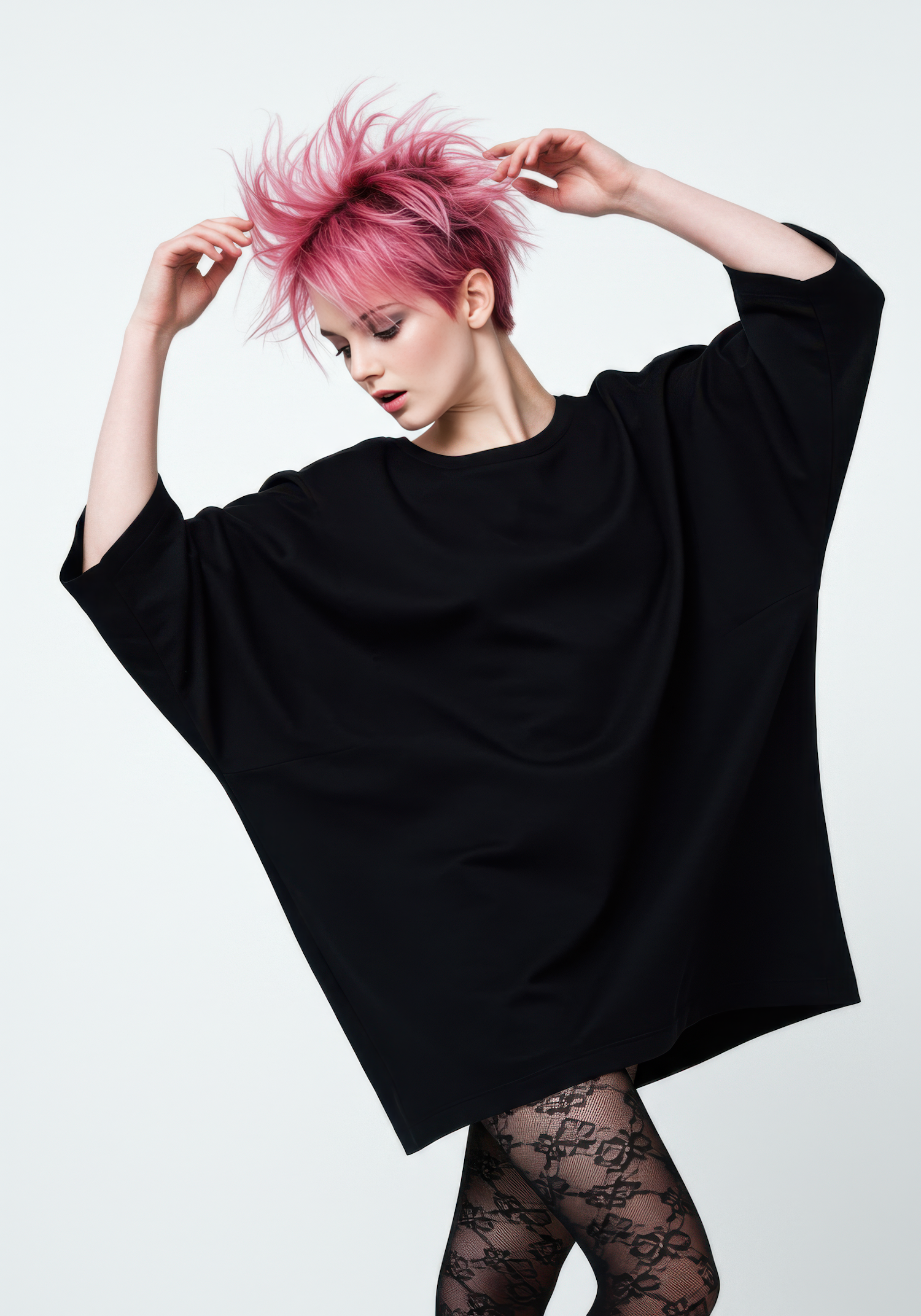 Stylish individual with spiky pink hair, a loose black top, and patterned tights, striking a dynamic pose against a white background.