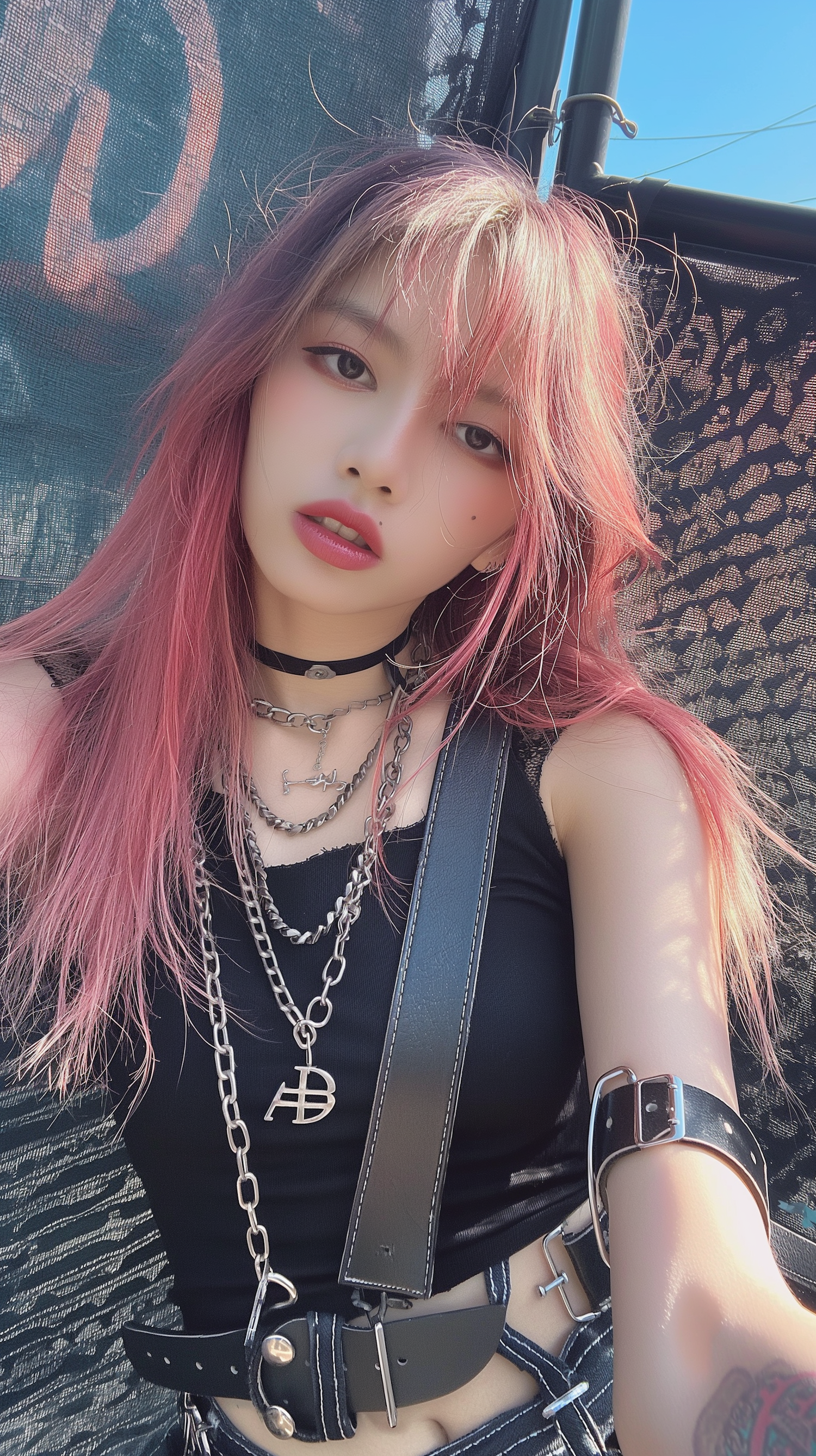 Asian woman with pink hair and bold makeup, wearing black and silver accessories, poses confidently against a patterned backdrop.