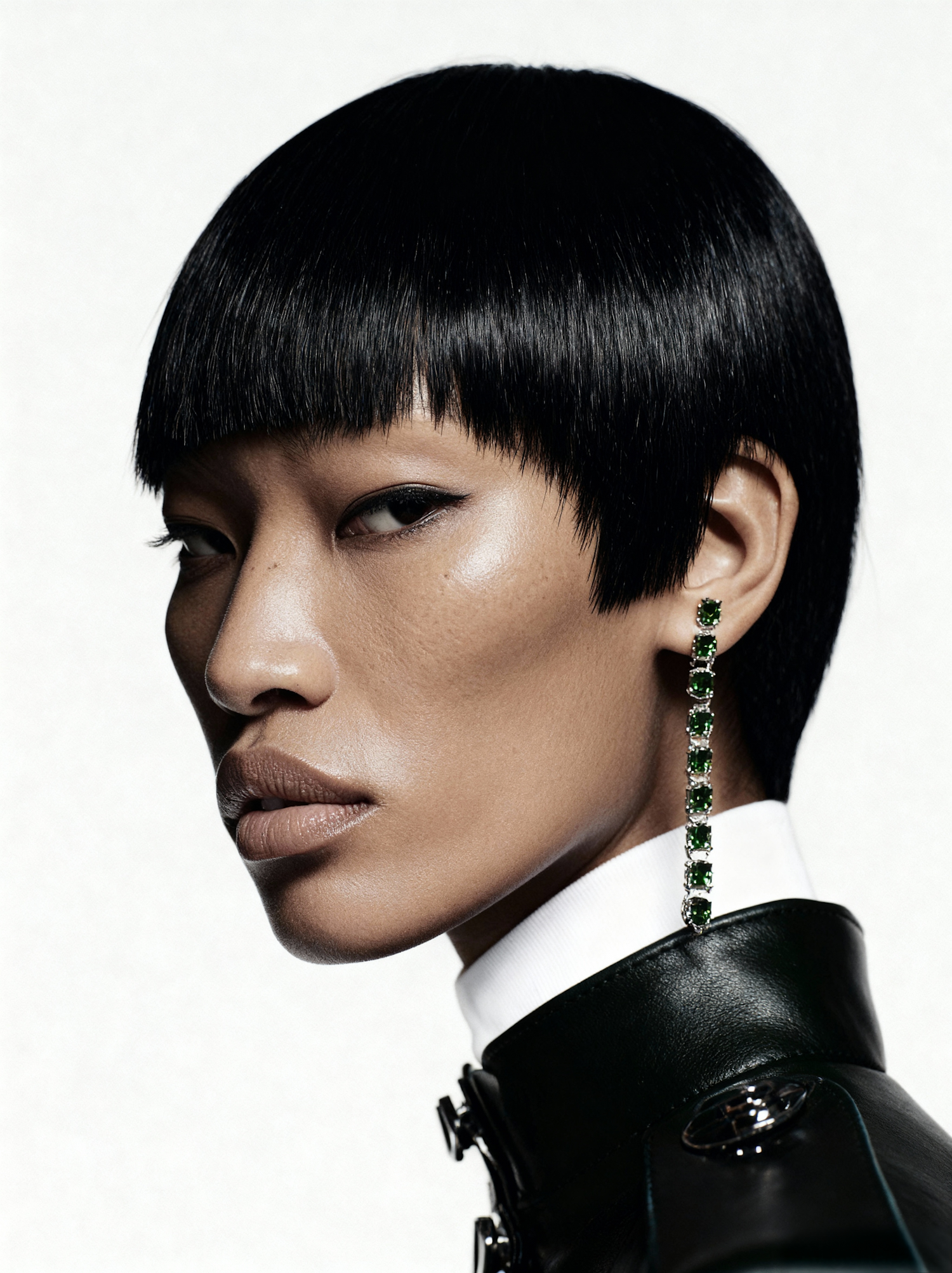 Close-up of a person with sleek black hair, wearing a green gemstone earring and a black leather jacket, against a white background.